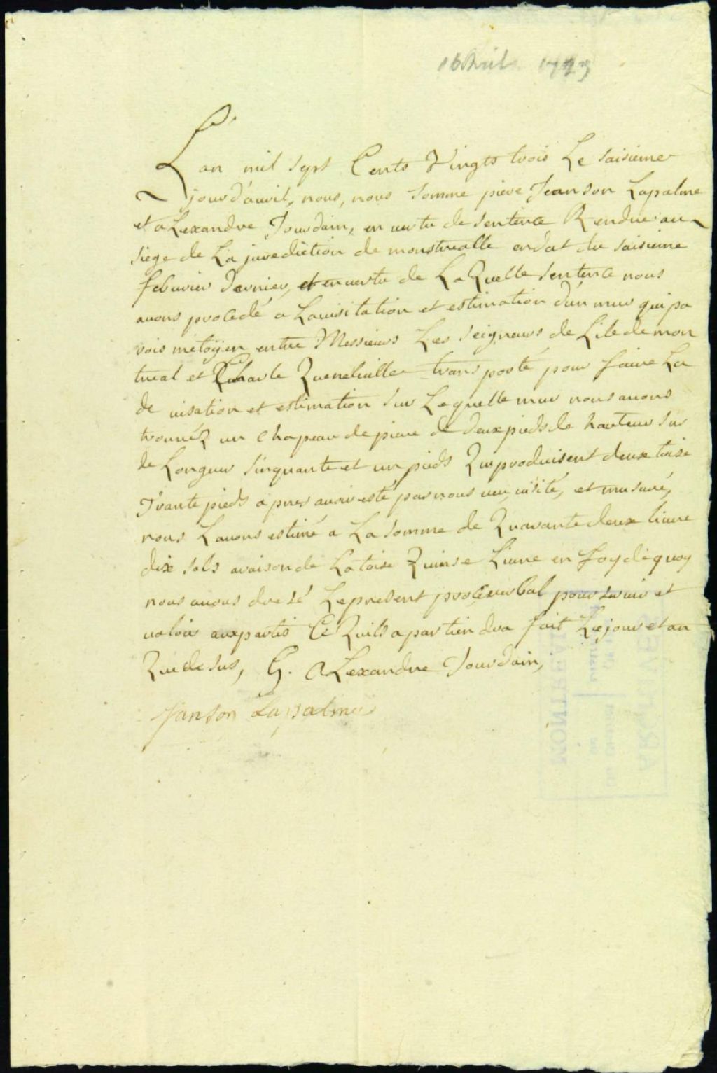 Procès entre les seigneurs de Montréal, demandeurs, et Charles Quenneville, fils, défendeur, pour le partage de frais d'un mur mitoyen, 16 avril 1723 - 13 septembre 1723, Archives nationales à Montréal, Fonds Juridiction royale de Montréal, (06M,TL4,S1,D2885).