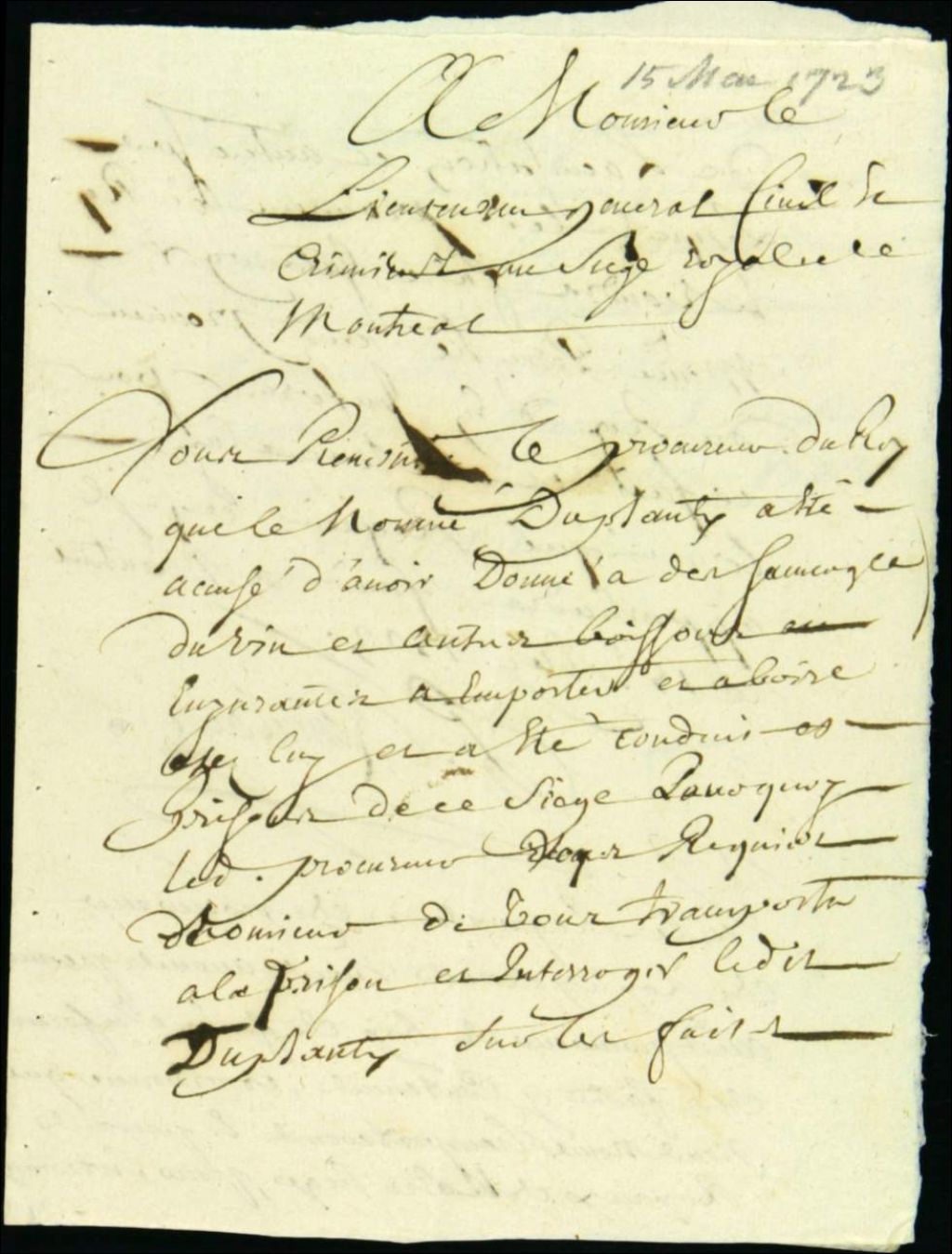 - Ce dossier de matière criminelle est composé des pièces suivantes : la requête pour la tenue d'une information judiciaire contre Jacques Héry, emprisonné et accusé d'avoir vendu de la boisson aux sauvages ; l'ordre de se transporter en prison pour l'interroger ; et son interrogatoire, celui-ci disant avoir acheté une paire de souliers anglais du sauvage iroquois Odachete en échange de boisson faite à base de jus de framboise. Il sait qu'il n'a pas de permis de vente de boisson mais fait valoir qu'il a neuf enfants à faire vivreOn retrouve aussi dans le dossier les pièces suivantes : la communication de l'interrogatoire au procureur du roi, lequel requiert la comparution de la femme de Duplanty pour interrogatoire ; le décret de comparution à la femme de Duplanty ; l'assignation ; l'interrogatoire de Jeanne Vanier, épouse de Jacques Héry, disant ne pas avoir de permis de vente de boisson ; le réquisitoire pour l'imposition d'une amende de cinquante livres pour vente sans permis ; le jugement qui condamne Jacques Héry à cinquante livres d'amende avec défense de récidiver et qui ordonne l'élargissement de l'accusé des prisons ; la signification de la sentence à Héry ; et le mémoire des frais de justice