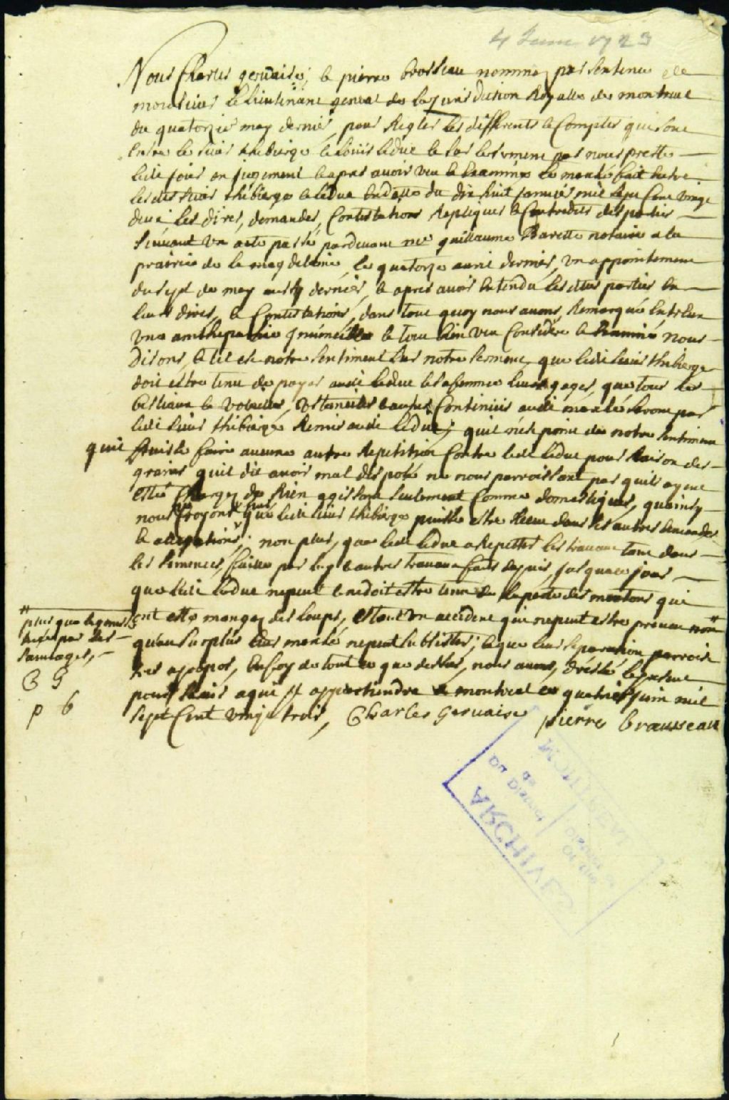 - Procès entre Thibierge, demandeur, et Louis Leduc, époux de Madeleine Lereau, domestique, défendeur, pour le paiement de travaux de ferme