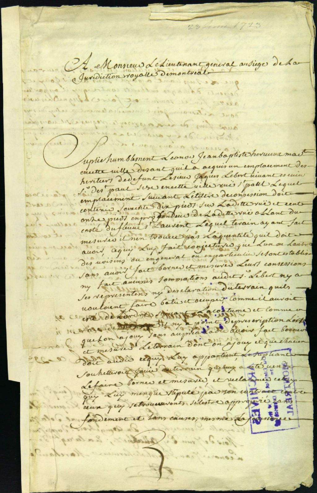 - Ce dossier de matière civile contient la requête de Léonard-Jean-Baptiste Hervieux, disant avoir acquis un emplacement des héritiers de Jacques Leber sur la rue Saint-Paul et qu'il soupçonne que ses voisins ont empiété sur son terrain. Il demande de faire assigner ceux-ci pour qu'ils produisent leurs titres et voir ordonner que les terres seront mesurées. On retrouve aussi la permission pour faire assigner les voisins de Hervieux à comparaître ; et la signification de la requête et l'assignation à comparaître servie à Charles Alavoine et [Harel dit Despointes?]