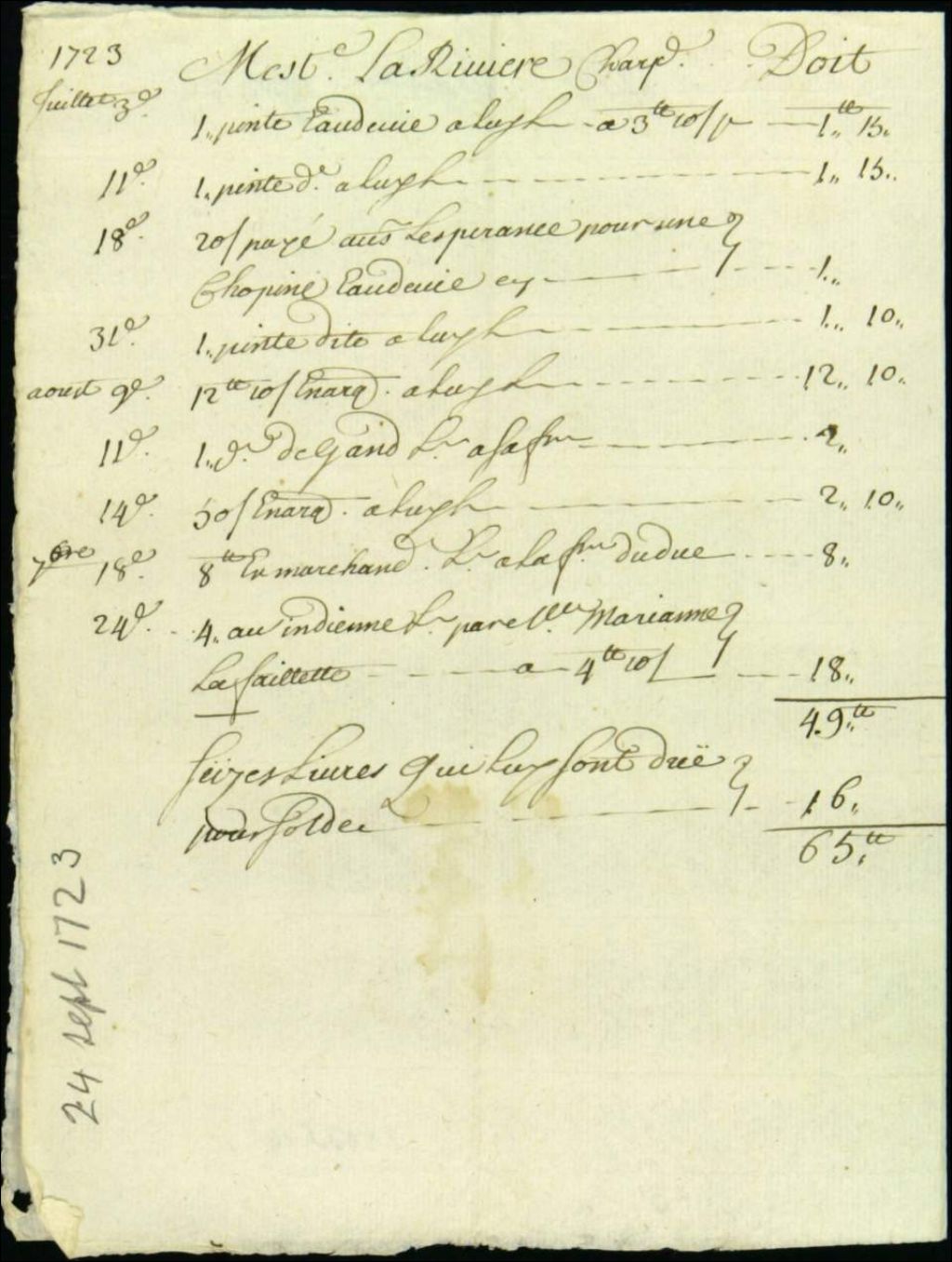 État de compte avec Tartre [dit Larivière?], charpentier, pour des transactions, 24 septembre 1723, Archives nationales à Montréal, Fonds Juridiction royale de Montréal, (06M,TL4,S1,D2976).