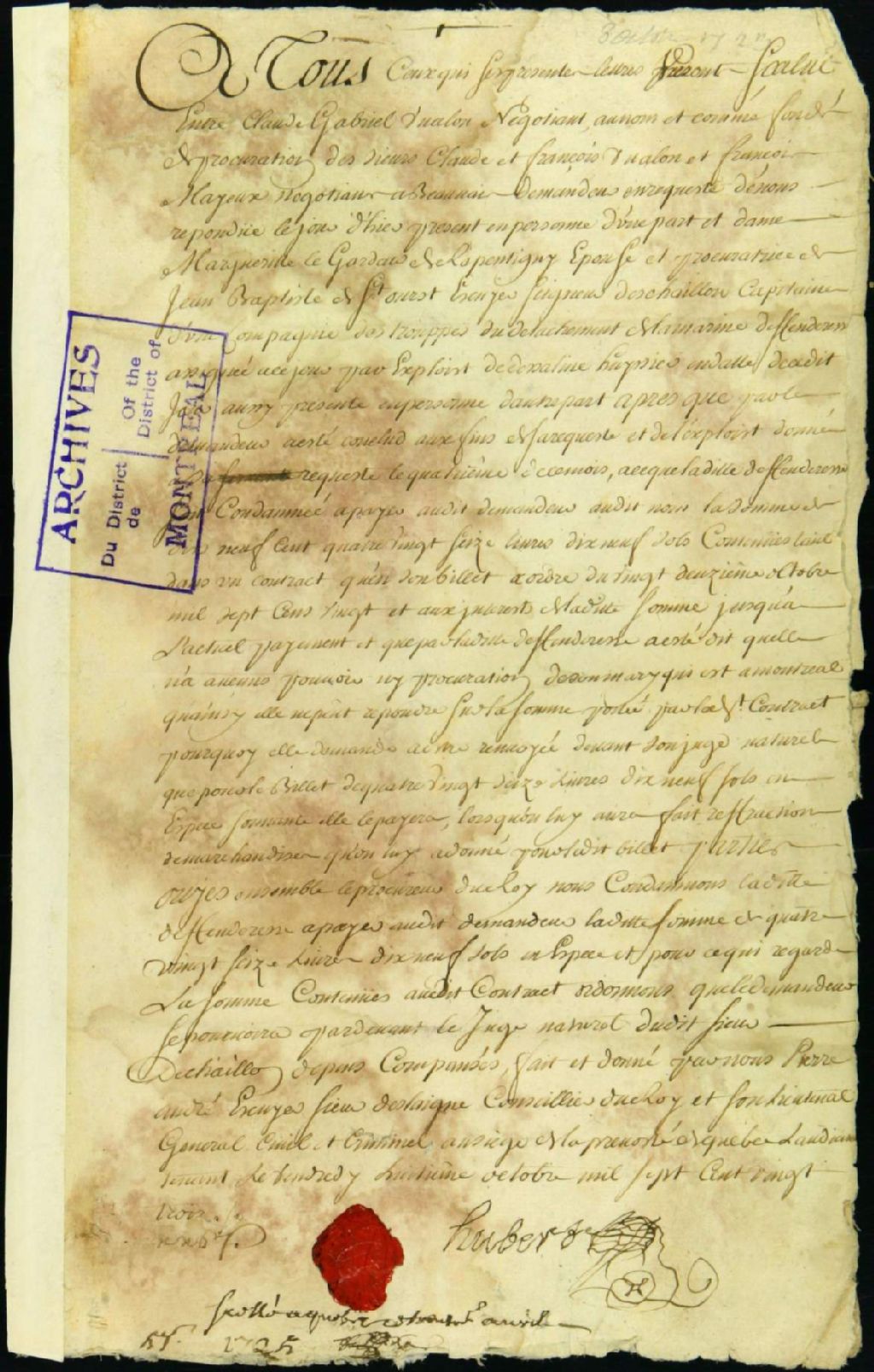 Procès entre Claude et François Vualon, marchands à Beauvais, et François Mayeux, négociant du même endroit, demandeurs, et Jean-Baptiste de Saint-Ours Deschaillons, défendeur, pour dettes, 8 octobre 1723 - 6 juin 1725, Archives nationales à Montréal, Fonds Juridiction royale de Montréal, (06M,TL4,S1,D2980).
