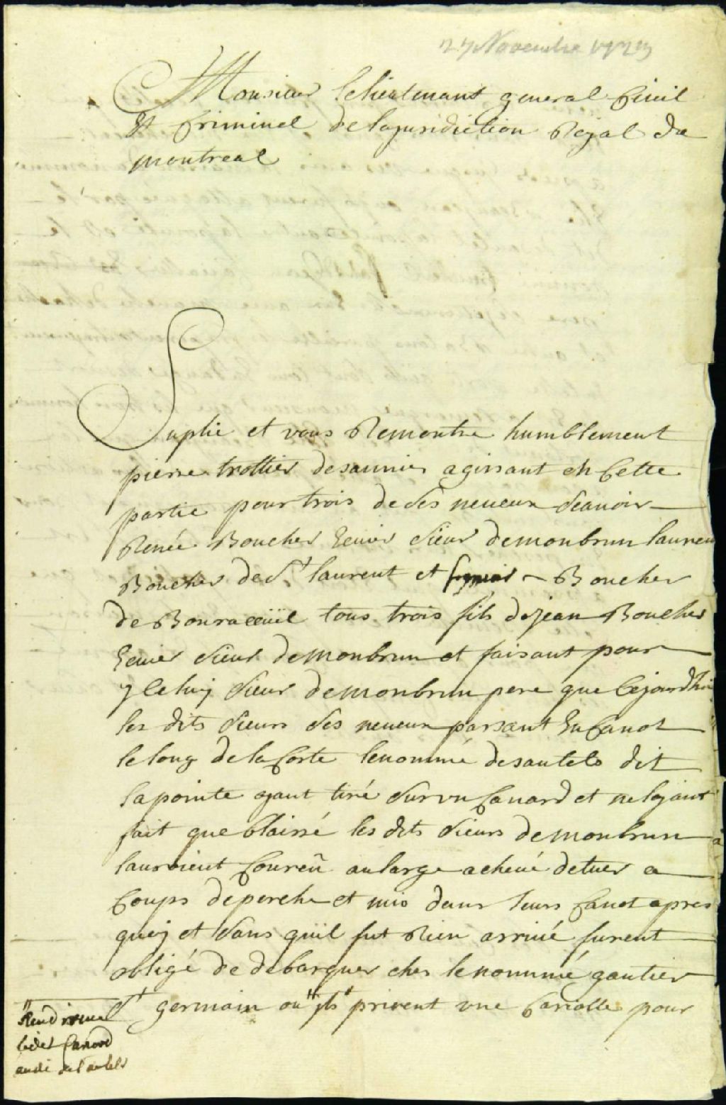 - Ce dossier de matière criminelle est d¿abord composé de la plainte de Pierre Trottier Desaulniers, agissant au nom de l'écuyer Jean Boucher, sieur de Monbrun, absent, père de trois de ses neveux, disant que ces derniers, les nommés René Boucher, fils, Laurent Boucher et François Boucher ont été attaqués, sauvagement battus et sérieusement blessés par Pierre et Louis Desautels et Lambert Cavelier, pour avoir pris et achevé un canard tiré par le nommé Pierre Desautels. Il demande de recevoir la plainte en l'absence du père de ses neveux et la tenue d'une information judiciaire. Le dossier contient ensuite : les ordres de faire examiner les blessés par les chirurgiens Timothée Sullivan et Jean Guichard dit Lasonde et de comparution des témoins de la poursuite ; le serment des chirurgiens experts ; le rapport de ceux-ci sur l'état des blessures des trois victimes ; la communication au procureur du roi, lequel requiert la prise de corps contre les accusés ; le décret de prise de corps ; et la requête de Jean Boucher qui entend que le procès continue en son nom mais se désiste des poursuites au criminel. Il demande le remboursement des frais médicaux et une pension alimentaire.Le dossier contient finalement : les requêtes pour la continuation du procès, le récolement des témoignages et le supplément d'information judiciaire ; les permissions qui s¿en suivent ; les ordres de comparution et d'assigner la femme de René Beaujean, habitant de Sainte-Marie, âgé de 52 ans, et Paul Poupard dit Lafleur, domestique chez la veuve de Blot, âgé de 17 ans, nouveaux témoins ; l'information judiciaire par addition ; le récolement des témoignages ; les frais de justice ; et le brouillon inachevé de l'introduction du jugement, non daté, mais certainement écrit après le 26 janvier 1724. Les documents mentionnent les témoins suivant : Jean Gauthier dit Saint-Germain, de Côte-Saint-Martin, âgé de 43 ans ; Jean-Baptiste Gauthier dit Saint-Germain, fils, âgé de 14 ans ; Pierre Botquin dit Saint-André, de Côte-Saint-Martin, âgé de 47 ans ; Marie Gauthier, âgée de 30 ans, épouse de ce dernier ; et Étienne Trudeau, âgé de 14 ans, fils de Pierre