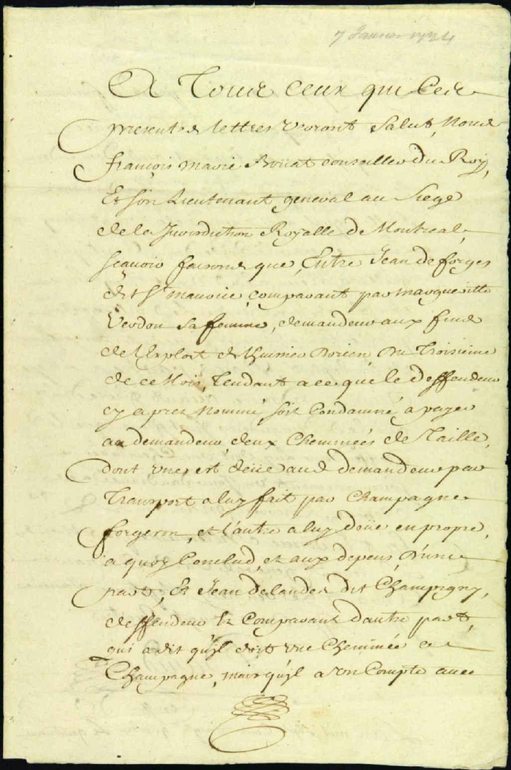 - Procès entre Jean Desforges dit Saint-Maurice, époux de Verdon, demandeur, et Jean Deslandes dit Champigny, défendeur, pour le paiement d'une cheminée en pierre