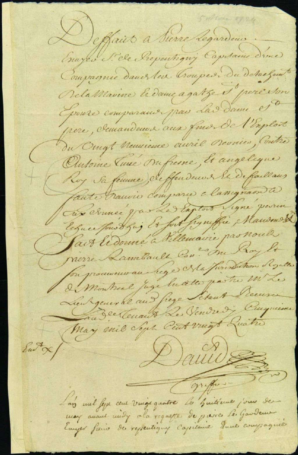 - Procès entre Pierre Legardeur de Repentigny, demandeur, et Antoine Thunay dit Dufresne, époux d'Angélique Roux, défendeur