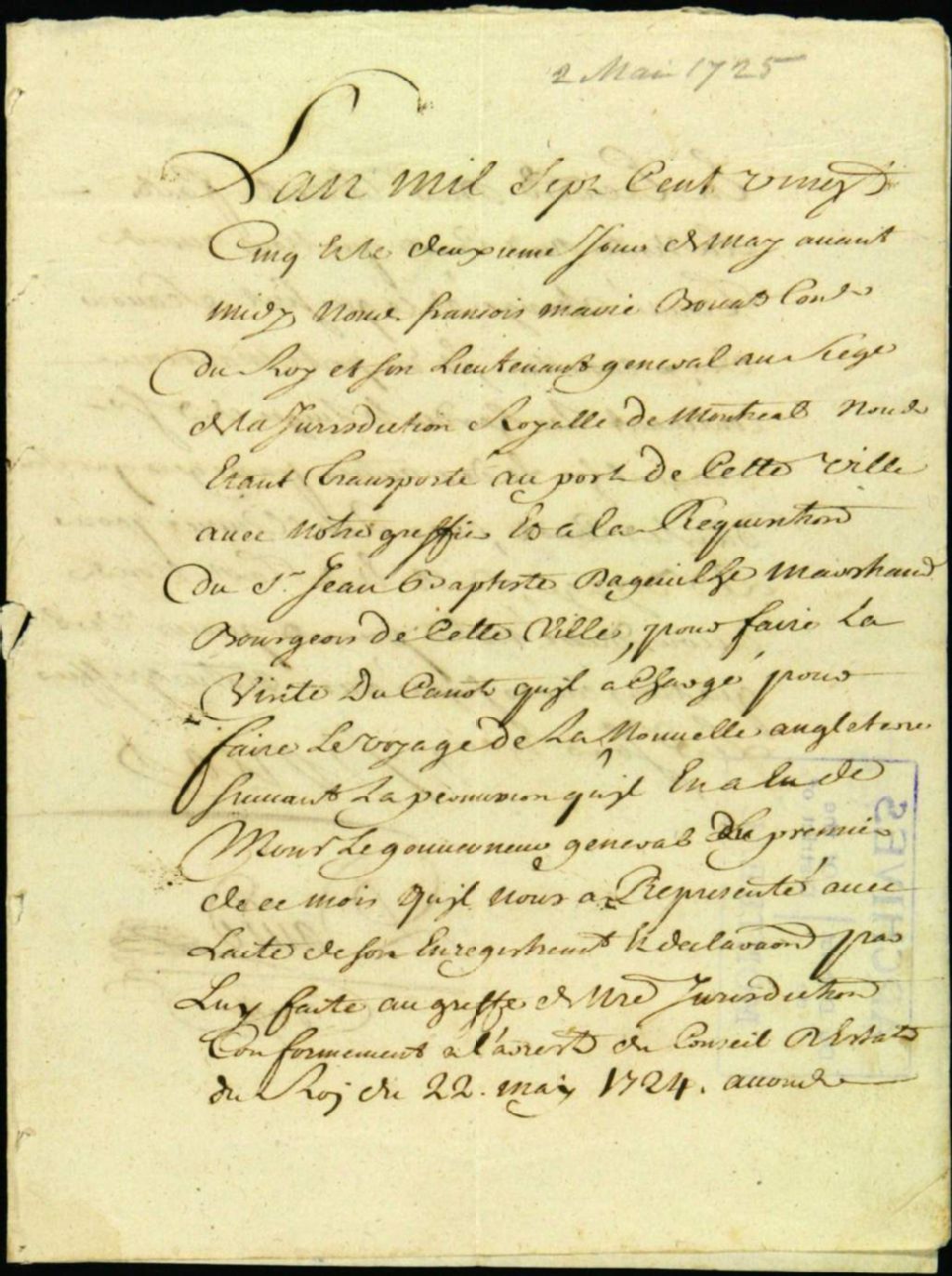 - Ce dossier d'administration civile contient les pièces suivantes : le procès-verbal de la visite au port de la ville de Montréal et de l'inventaire du canot de Jean-Baptiste Daguilhe, en partance pour la Nouvelle-Angleterre, tel que suivant son permis et le congé signé par le gouverneur général ; et la comparution au greffe de l'Anglais Édouard Collins, disant qu'il ne chargera dans son canot que des vivres et hardes de ses passagers et de lui-même