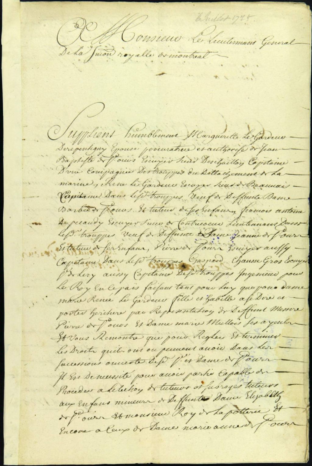 - Ce dossier d'administration judiciaire contient la requête de Marguerite Legardeur de Repentigny, procuratrice autorisée de Jean-Baptiste de Saint-Ours, sieur Deschaillons, et autres héritiers, pour tenir une réunion de parents et amis en vue d'élire un tuteur aux enfants mineurs des défunts Elisabeth de Saint-Ours et Charles Leroy , pour en venir au règlement de la succession de leurs parents, Pierre de Saint-Ours et de Marie Mulois ; et la permission de tenir une assemblée.Les requérants cités sont René Legardeur de Beauvais, Gaspard Chaussegros de Léry, époux de Saint-Ours