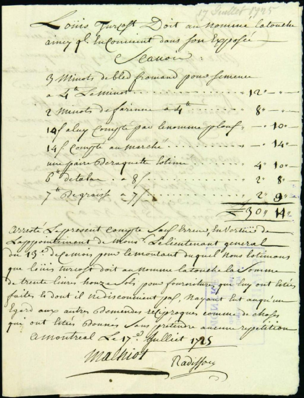 - Ce dossier d'administration judiciaire contient la remise au greffe d'un compte pour fournitures, arrêté par les arbitres François Maillot et Étienne Volant de Radisson, entre Louis Trucot et un « nommé Latouche, en vertu d'une sentence d'appointement du 13 juillet 1725