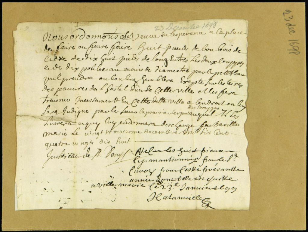 Commande de fournitures pour l'entretien des murs de la ville par Charles Juchereau, lieutenant général, à la veuve Lespérance, 23 décembre 1698 - 23 janvier 1699, Archives nationales à Montréal, Fonds Juridiction royale de Montréal, (06M,TL4,S1,D317).