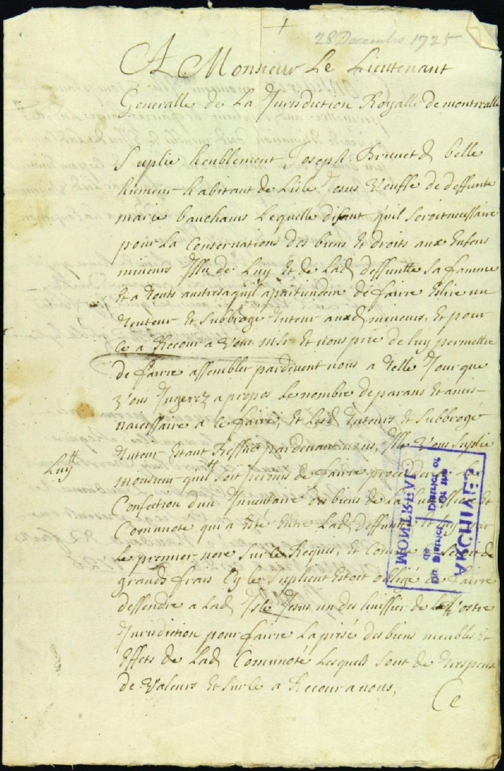 - Ce dossier d'administration judiciaire contient la requête de Joseph Brunet, habitant de l'ìle-Jésus, pour faire élire un tuteur à ses enfants issus de son mariage avec Marie Beauchamp, et faire l'inventaire des biens de la communauté par deux de ses voisins. On retrouve aussi la permission accordée par le lieutenant général