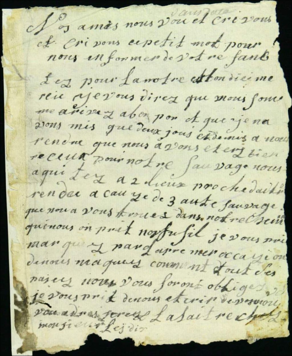 - Ce dossier de matière privée contient une lettre signée Bellefleur et Bacanal informant le destinataire qu'ils sont arrivés au terme de leur voyage et qu'ils peuvent recevoir du courrier via [Lydius?]. Les signataires font leurs compliments à la garnison Saint-Laurent