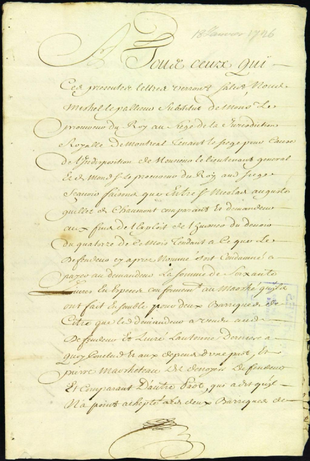 - Procès entre Nicolas-Auguste Guillet de Chaumont, demandeur, et Pierre Marcheteau dit Desnoyers, défendeur, pour le paiement de barriques de cidres
