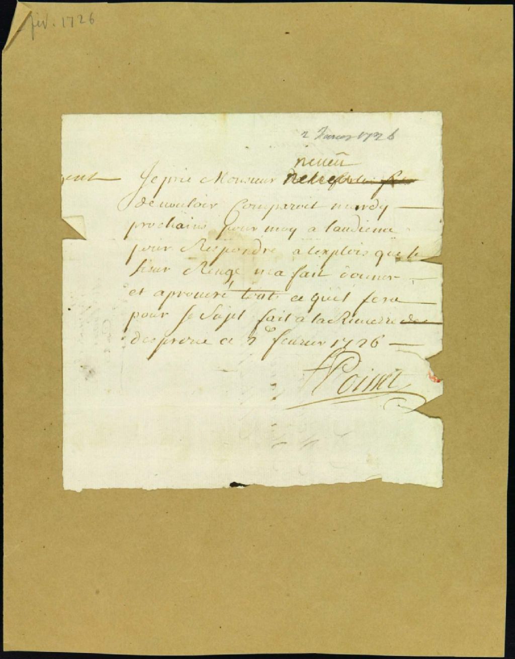 Procès entre Ranger, demandeur, et François Poisset, marchand de Rivière-des-Prairies, représenté par Neveu, défendeur, pour le paiement d'une dette, 2 février 1726 - 5 février 1726, Archives nationales à Montréal, Fonds Juridiction royale de Montréal, (06M,TL4,S1,D3214).