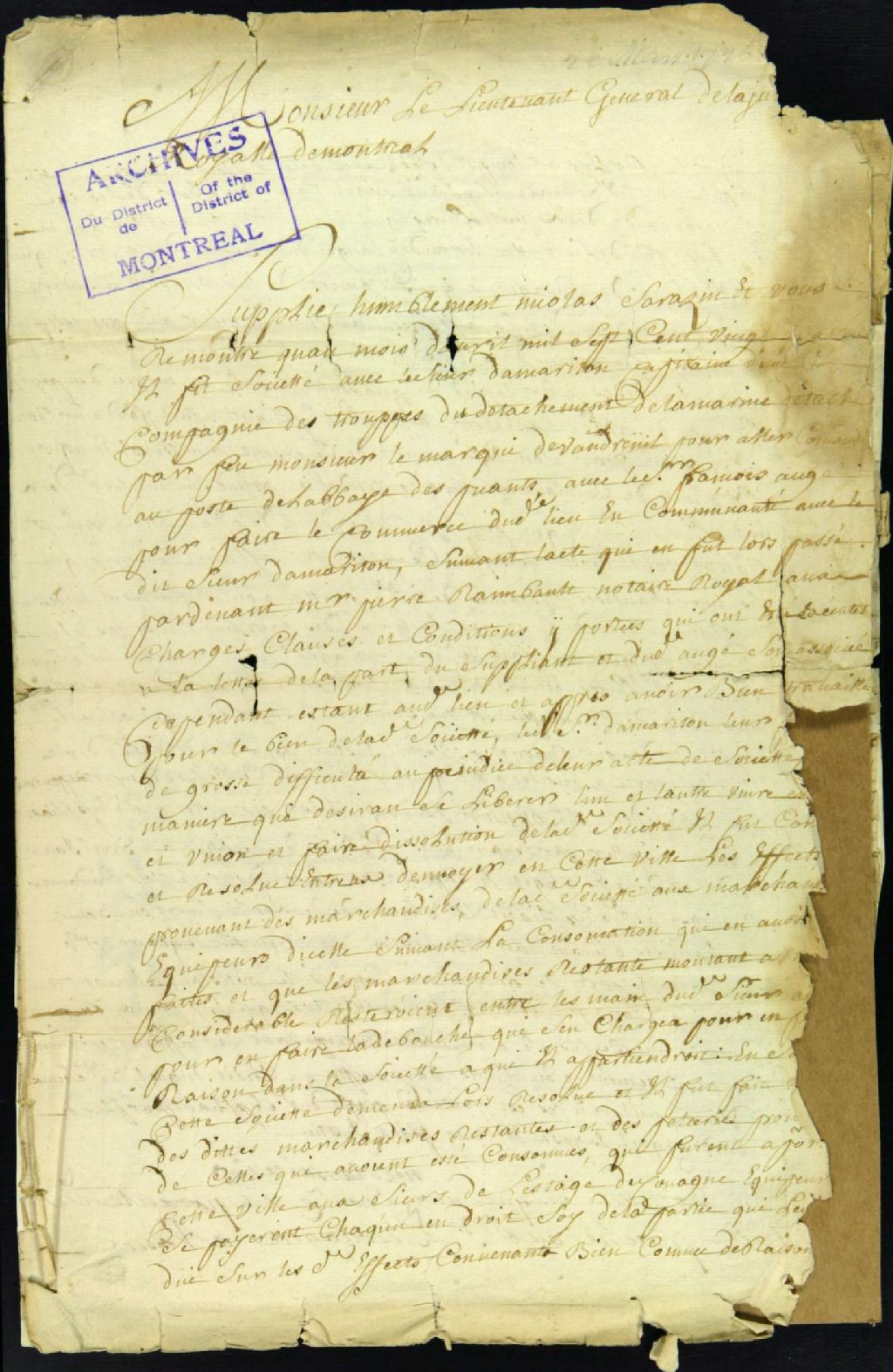 - Ce dossier de matière civile contient la requête de Nicolas Sarrazin, disant être en société avec le sieur Amariton, capitaine d'une compagnie des troupes commandant le poste de la Baie-des-Puants, et le sieur François Auger pour faire commerce. Il demande de faire assigner René de Couagne afin qu'il lui fournisse pour 2000 livres de marchandises. On retrouve aussi le désistement du lieutenant général ; la permission de faire assigner de Couagne à comparaître ; la signification et l'assignation à comparaître