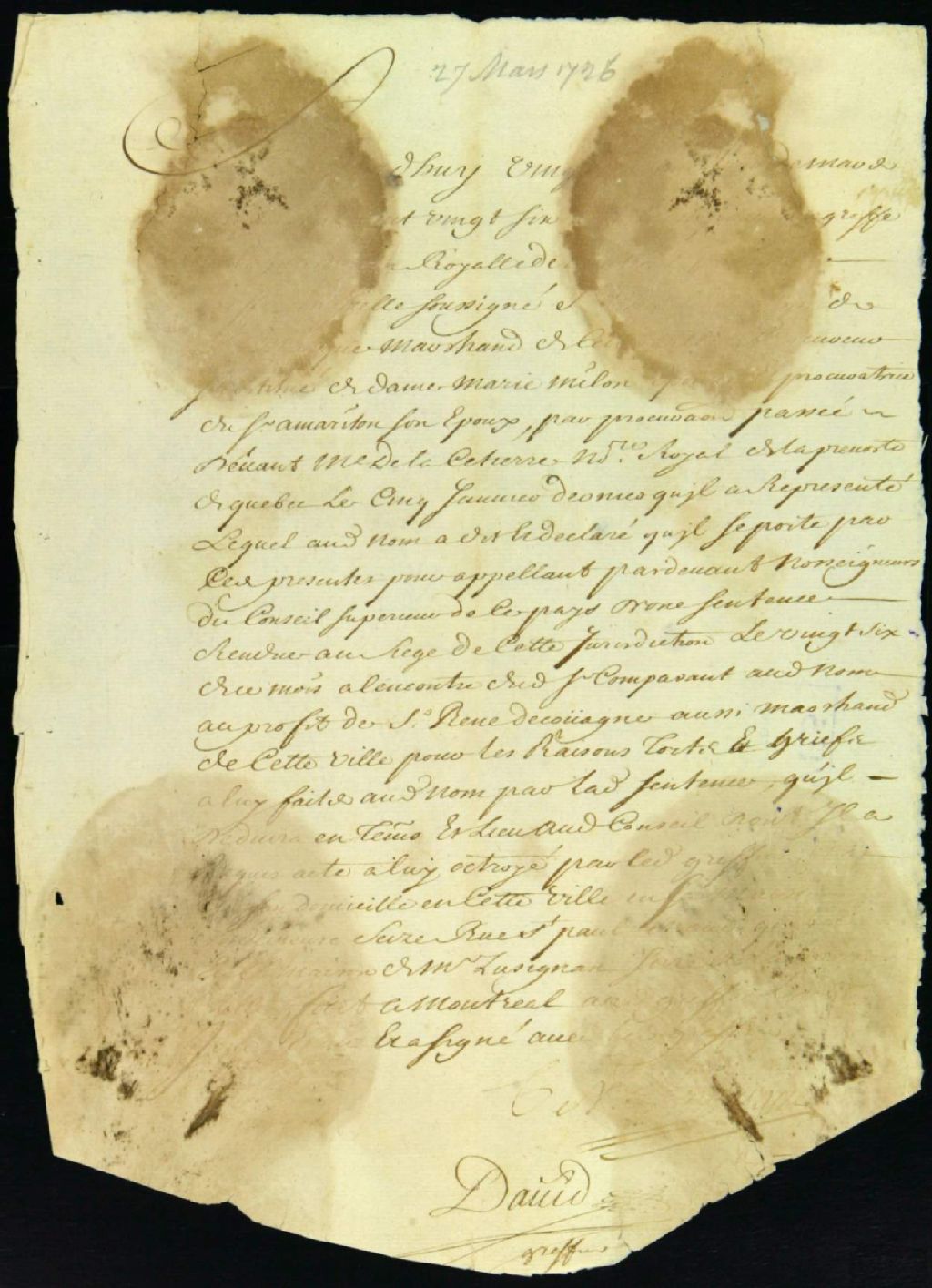 Procès en appel entre François Amariton, époux de Marie Million, requérant, et René de Couagne, intimé, 27 mars 1726, Archives nationales à Montréal, Fonds Juridiction royale de Montréal, (06M,TL4,S1,D3250).