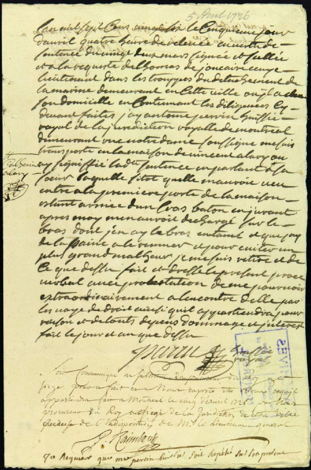 Procès entre Antoine Perrin, huissier, plaignant, et Catherine Alarie, accusée de rébellion, 5 avril 1726 - 10 avril 1726, Archives nationales à Montréal, Fonds Juridiction royale de Montréal, (06M,TL4,S1,D3252).