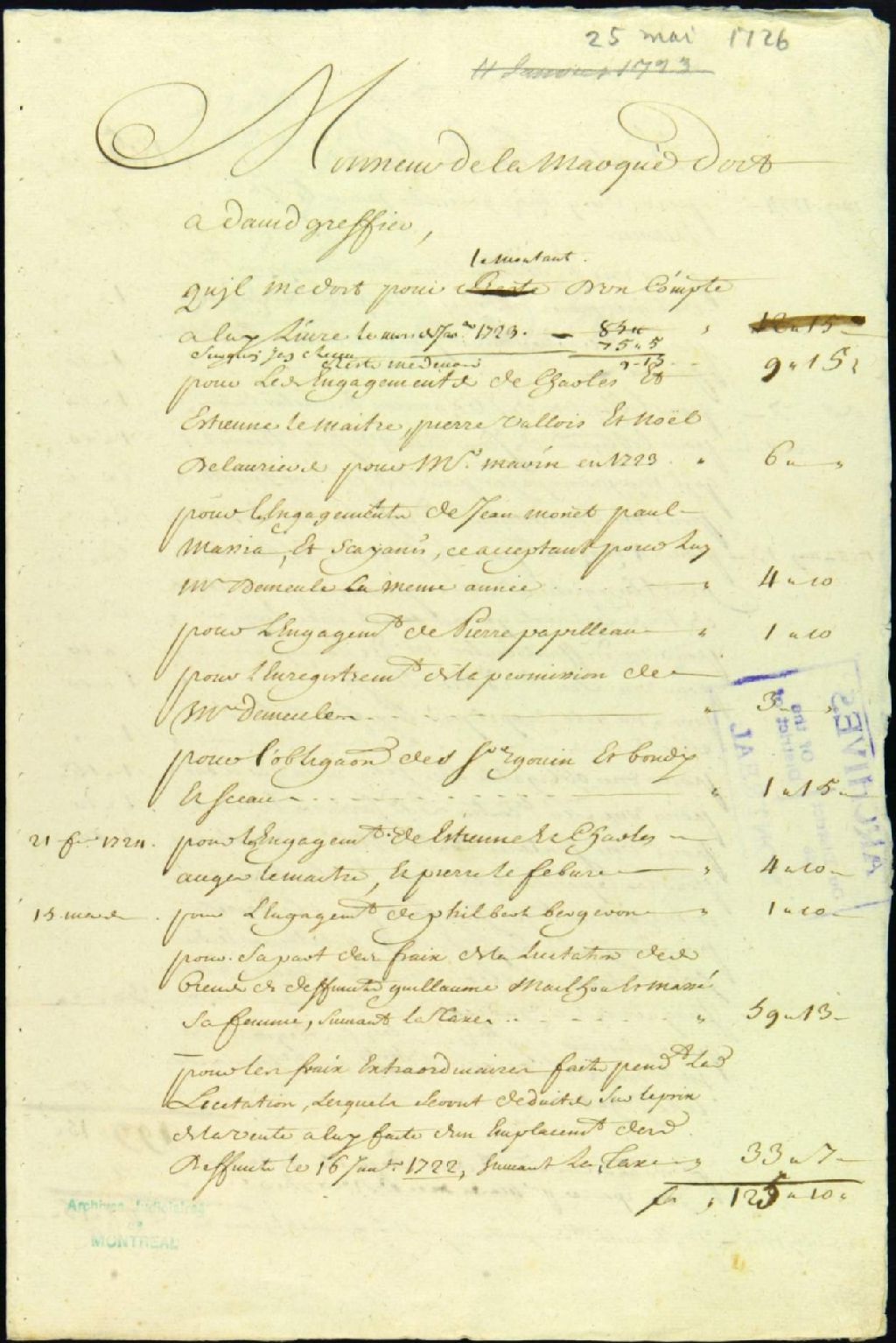État de compte du greffier de la Juridiction Royale de Montréal, Jacques David, pour services divers à [Nolan Lamarque?]