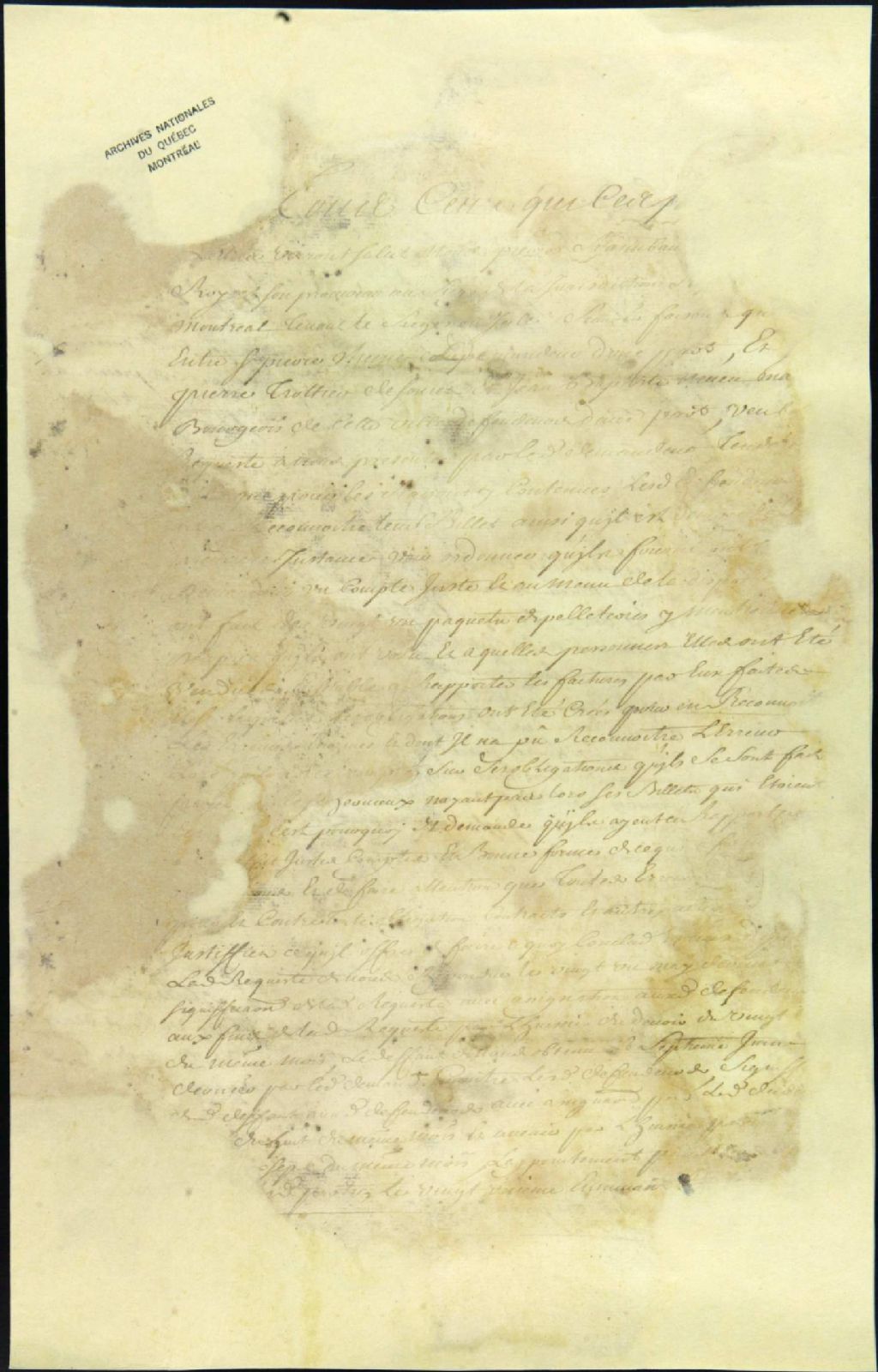 Procès entre Pierre Chesne, demandeur, et Pierre Trottier Desaulniers et Jean-Baptiste Neveu, tous deux marchand, défendeurs, relativement à des transactions, 18 juillet 1726 - 13 octobre 1727, Archives nationales à Montréal, Fonds Juridiction royale de Montréal, (06M,TL4,S1,D3303).
