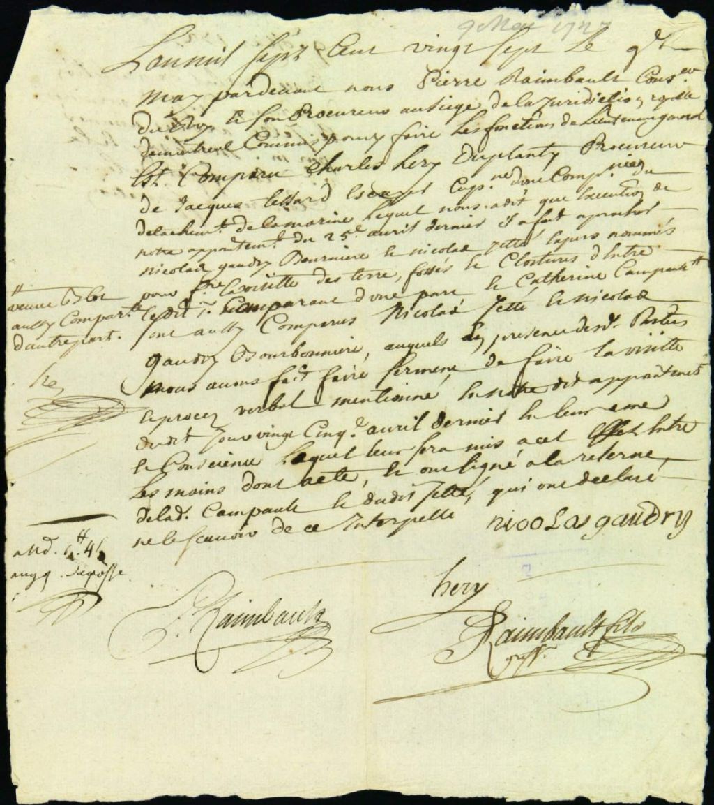 Procès entre Jacques Testard de Montigny, capitaine, demandeur, et Catherine Campeau, veuve de Bleau, défenderesse, pour le partage des frais d'une clôture et d'un fossé, 9 mai 1727, Archives nationales à Montréal, Fonds Juridiction royale de Montréal, (06M,TL4,S1,D3356).