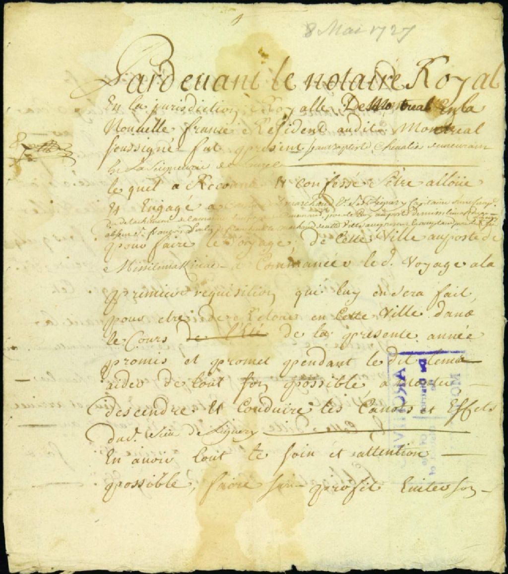 - Ce dossier de matière privée est composé de la convention écrite sur un formulaire d'acte notarié entre Jean-Baptiste Chevalier et Constant Lemarchand, sieur de Lignery, commandant à Michillimakinac, représenté par François Poulin, sieur de Francheville, par lequel Chevalier s'engage à faire le voyage de Montréal à Michillimakinac pour la somme de 160 livres, payable à son retour en ville. Charles Héry et René Desroches sont les témoins signataires de cet engagement