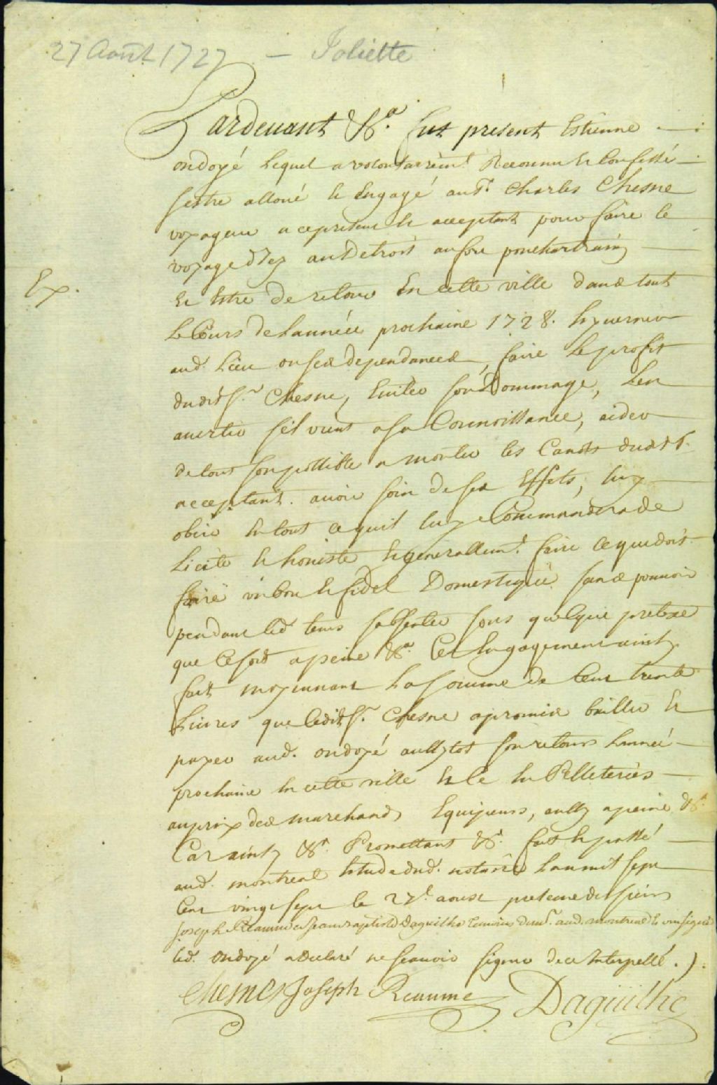 - Ce dossier de matière privée est composé de la copie secondaire d'un acte notarié pour l'engagement d' Étienne Ondoyer [Ondoyé] à Charles Chesne, voyageur, pour faire le voyage au fort Pontchartrain à Détroit et y hiverner jusqu' en 1728, pour la somme de 130 livres, payable à son retour à Montréal. Joseph Réaume et Jean-Baptiste Daguilhe sont les témoins signataires de ce contrat