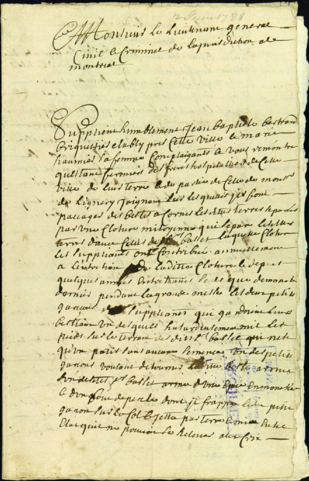 - Procès entre Jean-Baptiste Bertrand, briquetier, époux de Marie Aumier, plaignant, et Benoît Basset Linière, accusé de voies de fait