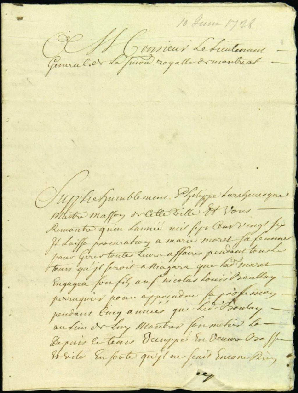 - Ce dossier de matière civile contient la requête de Philippe Larcheveque disant qu'en 1726 il avait donné une procuration à sa femme, Marie Desmarais, durant le temps qu'il était à Niagara et que cette dernière engagea son fils à Nicolas Boulay pour une période de cinq ans pour apprendre la profession. Il demande de pouvoir faire assigner à comparaître Boulay, pour le voir condamner à résilier le contrat d'engagement de son fils étant donné qu'il n'apprend rien, qu'il doit charrier de l'eau, couper du bois et subit des mauvais traitements.Le dossier contient la permission de faire approcher les parties; l'assignation à comparaître à Boulay ; la réponse de cette dernière disant ne pas vouloir faire affaire avec Larchevêque puisqu'il a signé un contrat avec Marie Desmarais et qu'il ne négociera qu'avec elle ; et la signification de la réponse de Boulay à Larchevêque