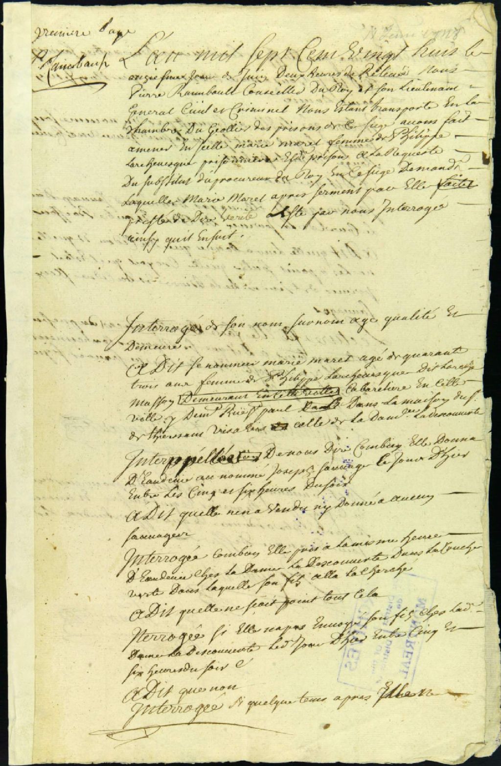 - Ce dossier de matière criminelle contient l'information judiciaire contre Marie Desmarais, accusée d'avoir vendu de l'eau de vie aux sauvages. Le dossier contient aussi l'interrogatoire de celle-ci ; la requête pour faire entendre la dame de LaDécouverte ; l'ordre de comparution ; l'ordre d'assigner la dame LaDécouverte et Gadois Mauger ; et la déposition de Madeleine Just, veuve LaDécouverte.Les témoins suivant sont mentionnés dans cette affaire : Joseph Leduc, 38 ans, charretier ; Bernard Dumouchel, 40 ans, brigadier des gardes de la compagnie des Indes et François Suzor, 40 ans, garde de la compagnie des Indes