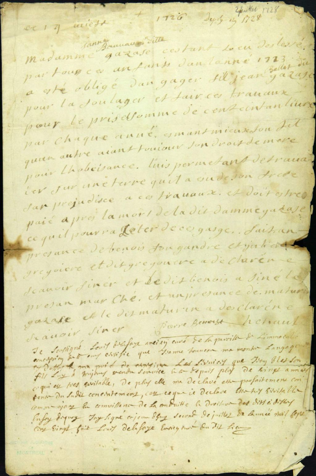 - Ce dossier de matière privée est composé du contrat d'engagement par Jeanne Beauveau de son fils Jean Blet, pour la somme de 150 livres par an pour la soulager dans son travail, fait en date du 14 juillet 1726. Au bas du contrat, une note datée du 2 juillet 1728 par Louis de Lafaye, ancien curé de Saint-Ours, atteste que la dame Gazaille lui a affirmé que son fils lui a toujours rendu service depuis plus de 20 ans et qu'elle en est bien satisfaite