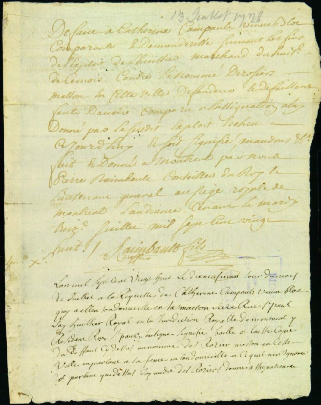 - Procès entre Catherine Campeau, veuve de Bleau, demanderesse, et Desrosiers, maçon, défendeur