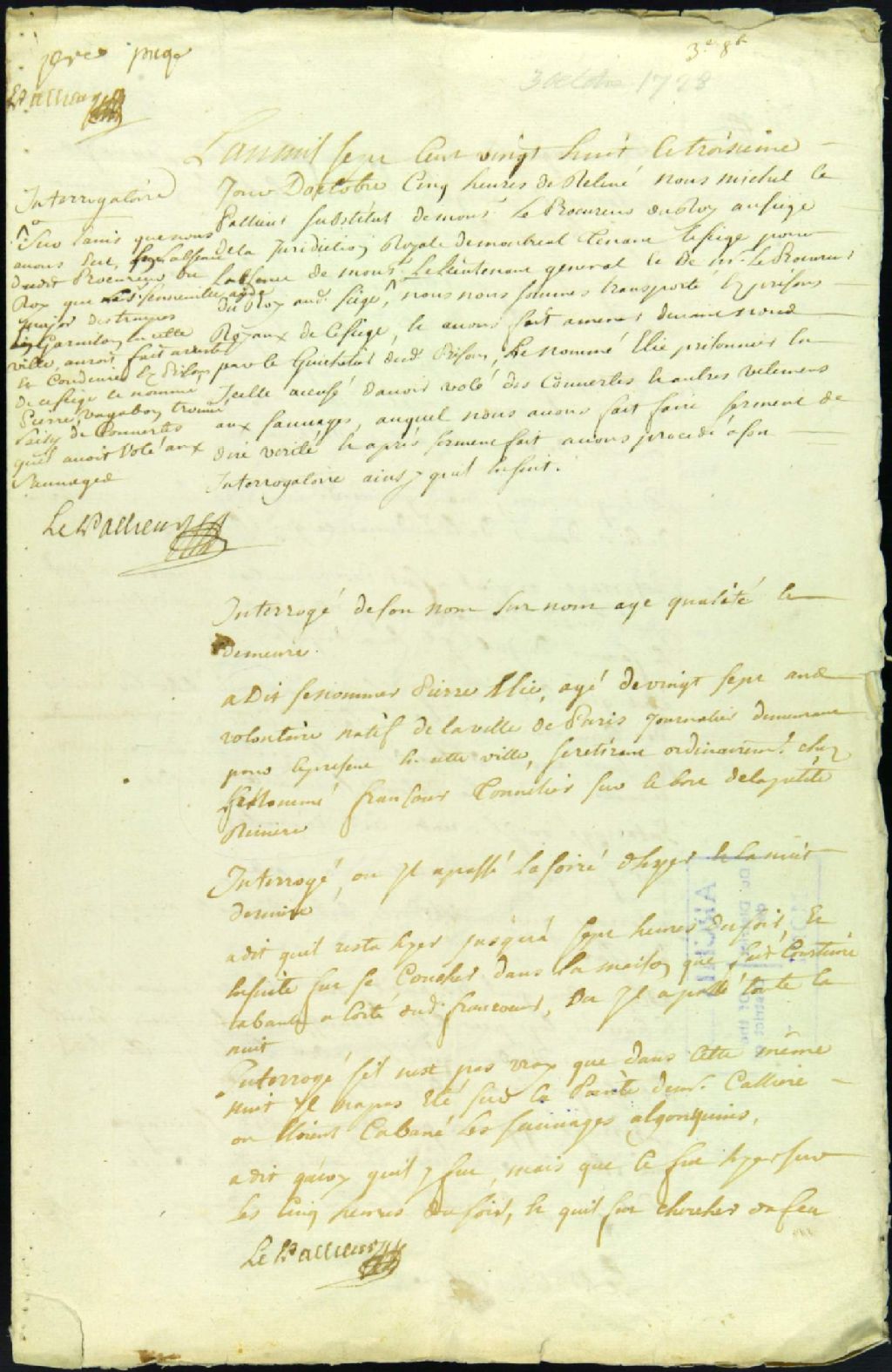 - Procès contre Pierre Richard dit Bonvouloir, alias Pierre Élie, soldat de la Compagnie Leverrier, fils de François Richard, ébéniste de la rue Saint-Antoine à Paris, accusé de vol de couverture aux sauvages