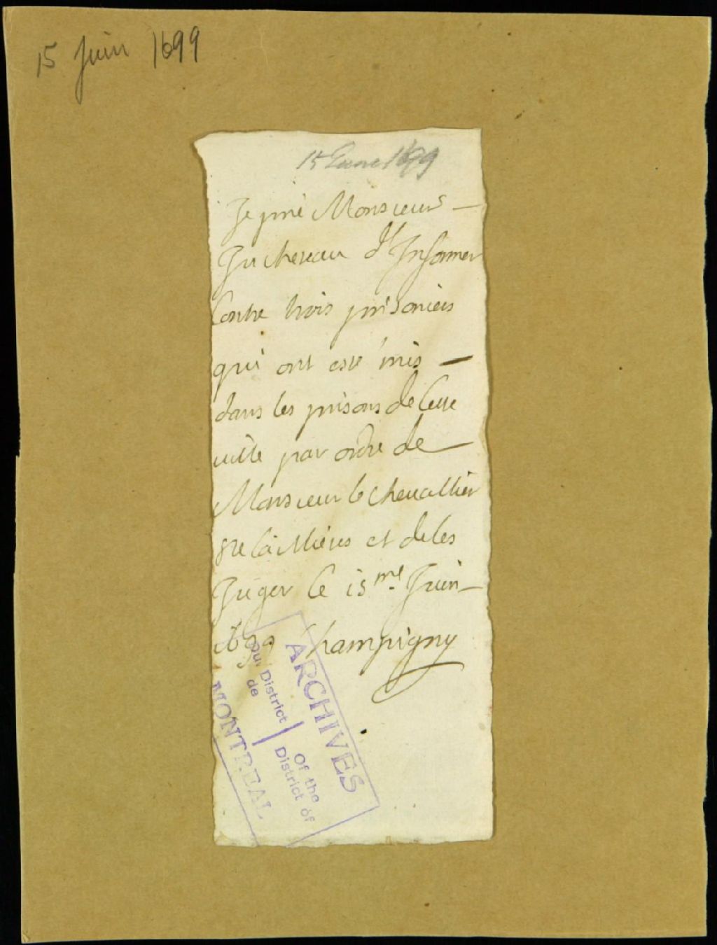 - Ce dossier de matière criminelle est composé des pièces suivantes : la requête de l'intendant Champigny, demandant de juger Quévillon, Bousquet et Hunault, prisonniers par ordre du chevalier Callières, accusés d'avoir fait la traite avec les Indiens à la Petite Nation; les faits sur lesquels l'intendant désire que le lieutenant général interroge les accusés et les interrogatoires ; l'information judiciaire ; et l'assignation à comparaître des témoins. L'opinion du procureur du roi complète le dossier.Les témoins sont : qui sont : Michel Fily de Kerrigou, sergent de la compagnie LeVerrier ; Louis Bouilly dit Deslauriers, soldat de la compagnie Maricourt ; François Queré dit Lavallée, soldat de 32 ans ; et Jean [?] Hérou dit Labarrière, soldat de la compagnie Bergères