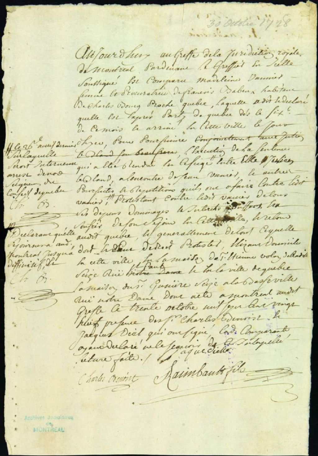 Procès entre Madeleine Vanier, épouse de François Barbeau, habitant de Charlesbourg, demanderesse, et Jean Vanier et al., défendeurs, 30 octobre 1728, Archives nationales à Montréal, Fonds Juridiction royale de Montréal, (06M,TL4,S1,D3491).