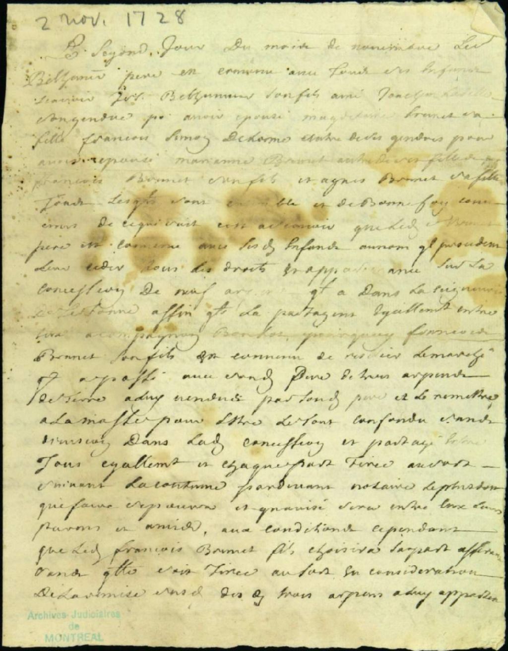 - Entente de partage d'un héritage entre François Brunet dit Belhumeur, veuf de Ménard, époux de Marie Renaud, et ses enfants du premier lit Joseph, François et Agnès