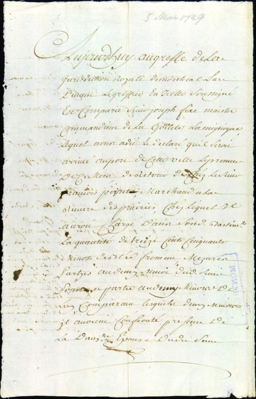 - Déclaration au greffe par Joseph Fisk, commandant de la goélette « La mignone » concernant la mesure pour évaluer le chargement de blé