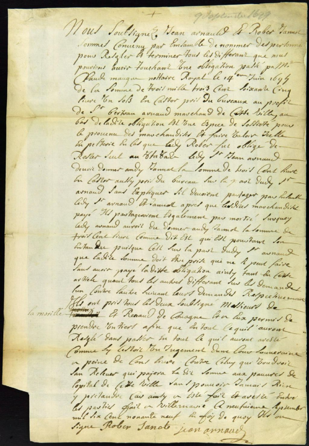 Convention établie par arbitres entre Jean Arnaud et Robert Janot, sociétaires, au sujet du paiement d'une obligation, 9 septembre 1699, Archives nationales à Montréal, Fonds Juridiction royale de Montréal, (06M,TL4,S1,D367).