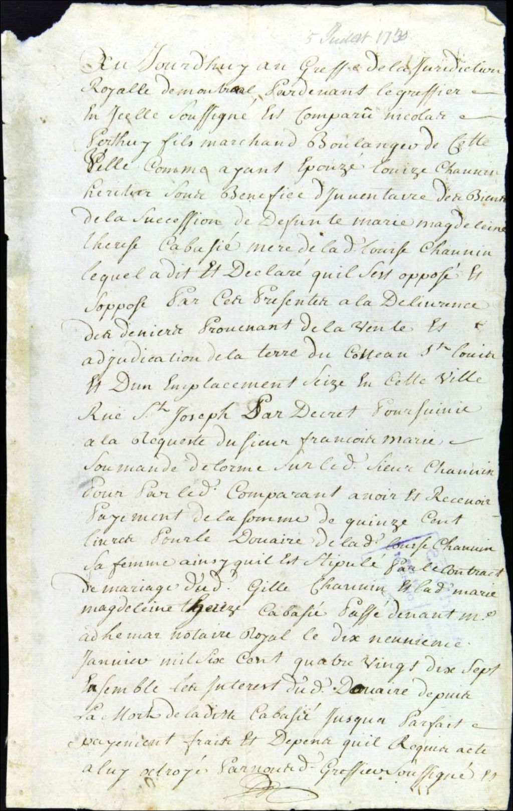 - Ce dossier de matière civile est composé des pièces suivantes : l'opposition au greffe par Nicolas Perthuis, fils, marchand boulanger, époux de Louise Chauvin, et Jacques Gadois dit Mauger, marchand, sur les biens qui proviendront de la vente par décret des emplacements situés sur la rue Saint-Joseph et au Coteau-Saint-Louis, appartenant à Gilles Chauvin, saisis à la requête de François-Marie Soumande ; une autre opposition semblable ; et la signification de l'opposition à Anne Chaspoux le 30 juillet