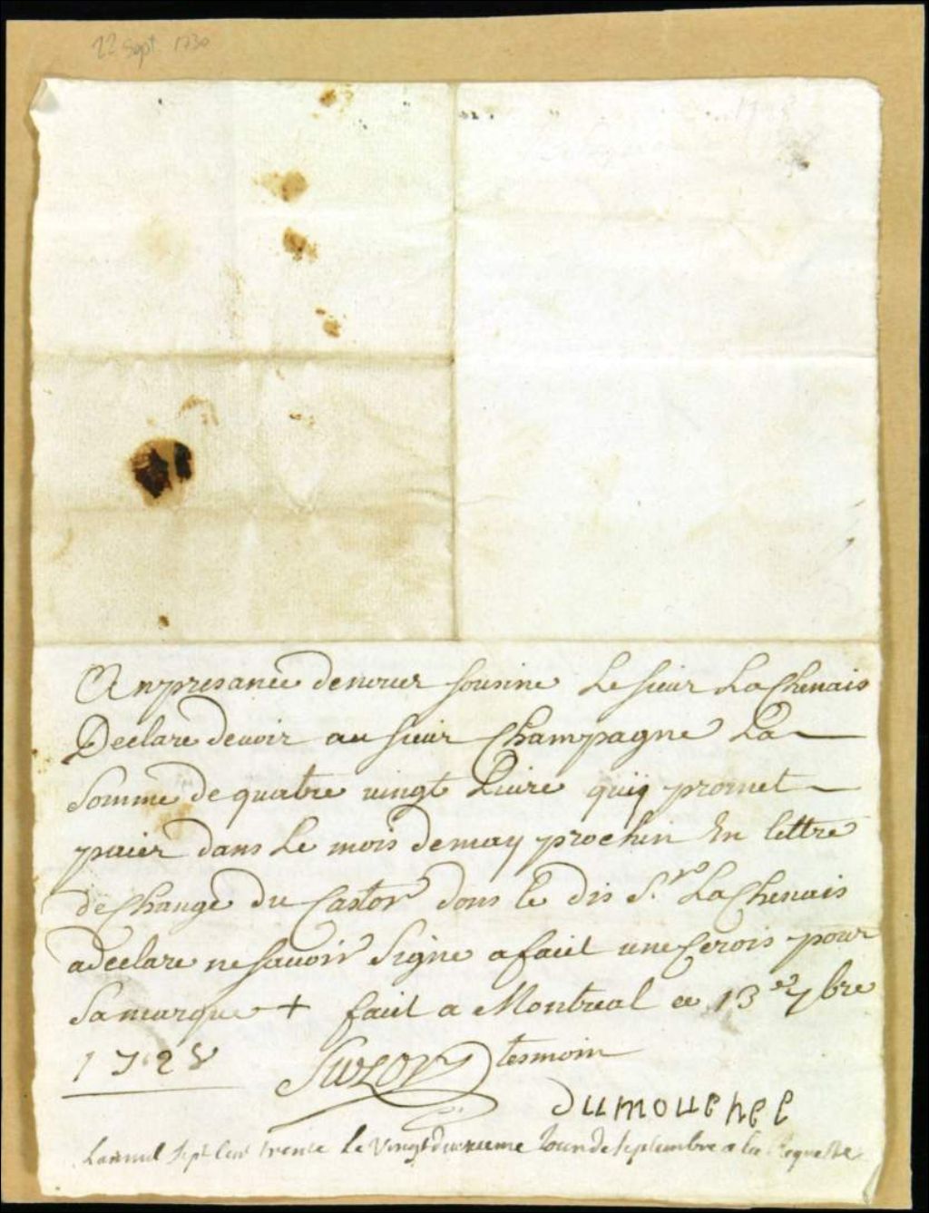 - Ce dossier de matière civile est composé des pièces suivantes : la signification d'un billet rédigé et daté du 13 septembre 1728 par [Lachesnaye?] en faveur de Jean Fontenelle dit Champagne pour la somme de 80 livres ; et l'assignation servie au signataire du billet impayé
