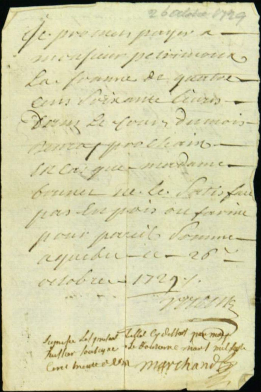 - Ce dossier de matière civile est composé des pièces suivantes : la requête d'Étienne Rocbert disant s'être rendu caution pour 460 livres envers le sieur Pétrimoulx, marchand de Québec, pour Jean-Baptiste Brunet, lequel n'a pas satisfait à ses obligations. Le demandeur désire le faire assigner à comparaître pour récupérer la somme qu'il a été dans l'obligation de payer. Il demande également de pouvoir faire saisir ce qu'il trouvera, appartenant au défendeur; la permission de faire approcher les parties et de saisir entre-temps les actifs du défendeur ; la signification à partie et la saisie des mains de François Lepailleur, tierce partie ; le billet de Rocbert envers Pétrimoulx, endossé par de Lestage ; et la quittance envers Rocbert