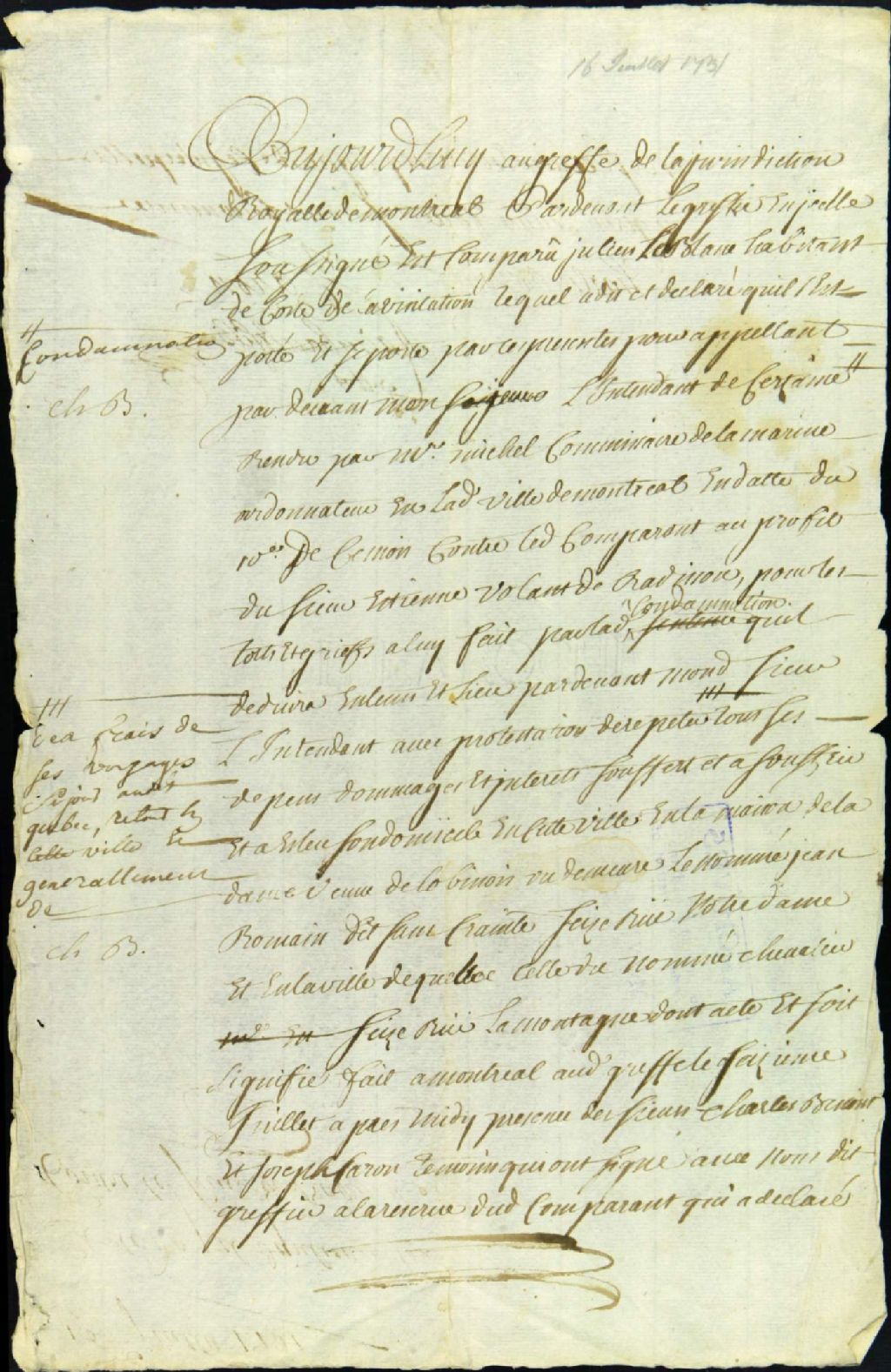 - Ce dossier de matière civile est composé de l'appel de sentence par Julien Leblanc contre un jugement rendu par Michel, ordonnateur de la marine, le 10 de ce mois, en faveur de Étienne Volant