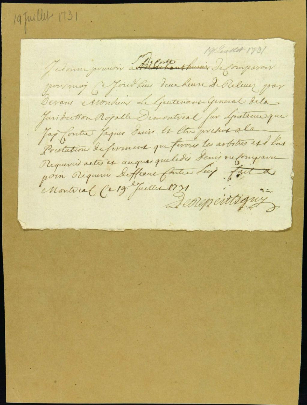 Procès entre Jean-Baptiste Legardeur, sieur de Repentigny, demandeur, et Jacques Denis, défendeur, au sujet de travaux, 19 juillet 1731, Archives nationales à Montréal, Fonds Juridiction royale de Montréal, (06M,TL4,S1,D3846).