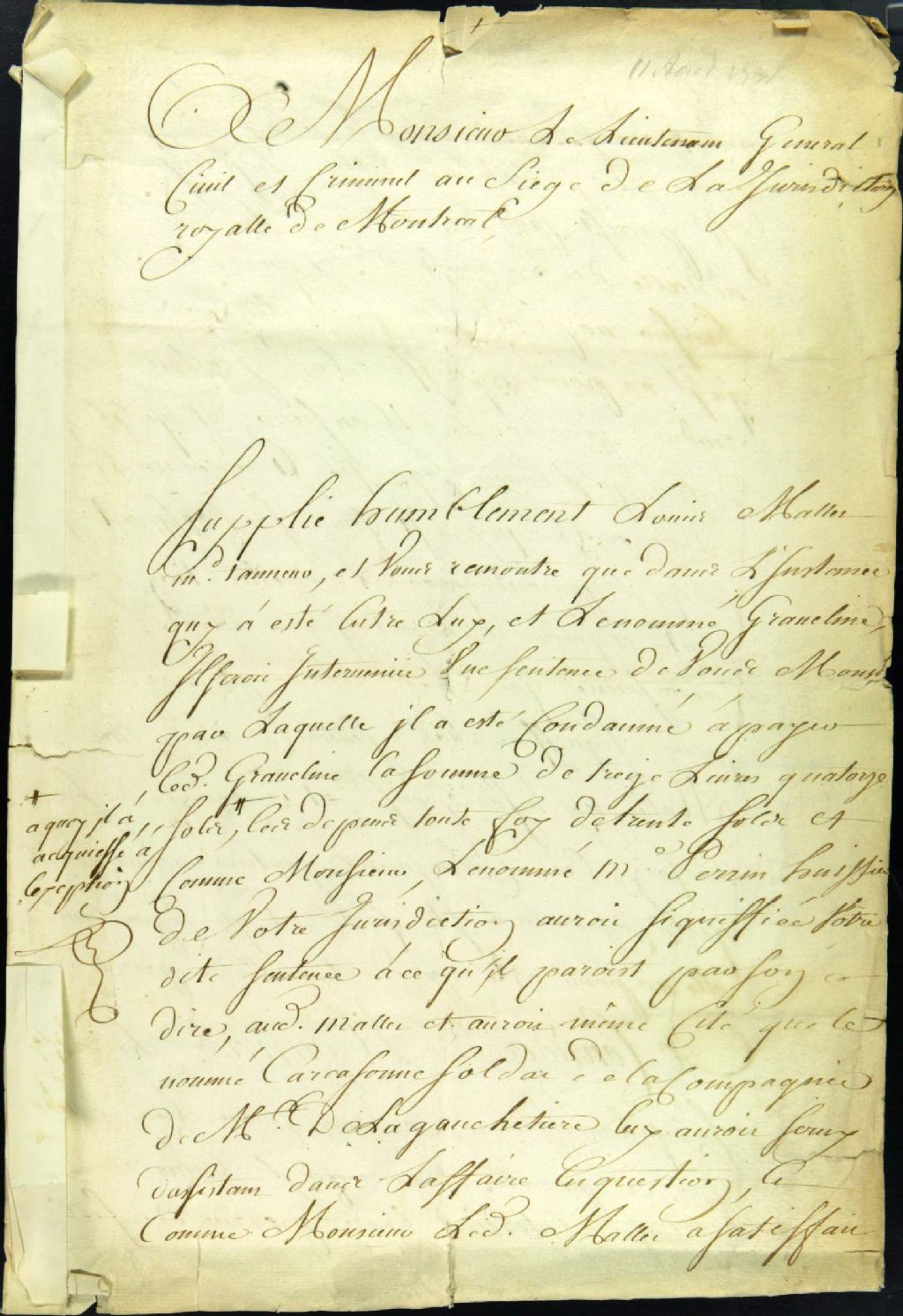 - Ce dossier de matière privée est composé des pièces suivantes : la lettre adressée à Mallet par Le Bau réclamant le remboursement des frais de justice dans le règlement d'une sentence contre Mallet. Elle est paraphée le 17 août par le lieutenant général; la requête de Louis Mallet pour faire interdire de fonction l'huissier Perrin, lequel n'aurait pas signifié une sentence à LeBau; la communication au procureur du roi, lequel requiert de prouver les faits; l'ordonnance pour assigner les parties; la signification à l'huissier Perrin et l'assignation à comparaître. Les documents citent Carcosonne, soldat de la compagnie LaGauchtière, comme témoin et Baudreau dit Graveline comme tierce partie