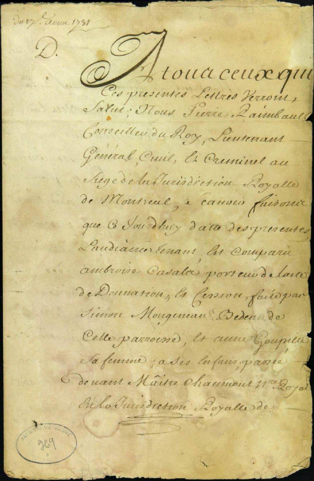Insinuation de la cession faite par Anne Goupil, veuve de Aimé Lecomte, épouse de Simon Mongeneau, bedeau, à ses enfants, 17 août 1731, Archives nationales à Montréal, Fonds Juridiction royale de Montréal, (06M,TL4,S1,D3859).