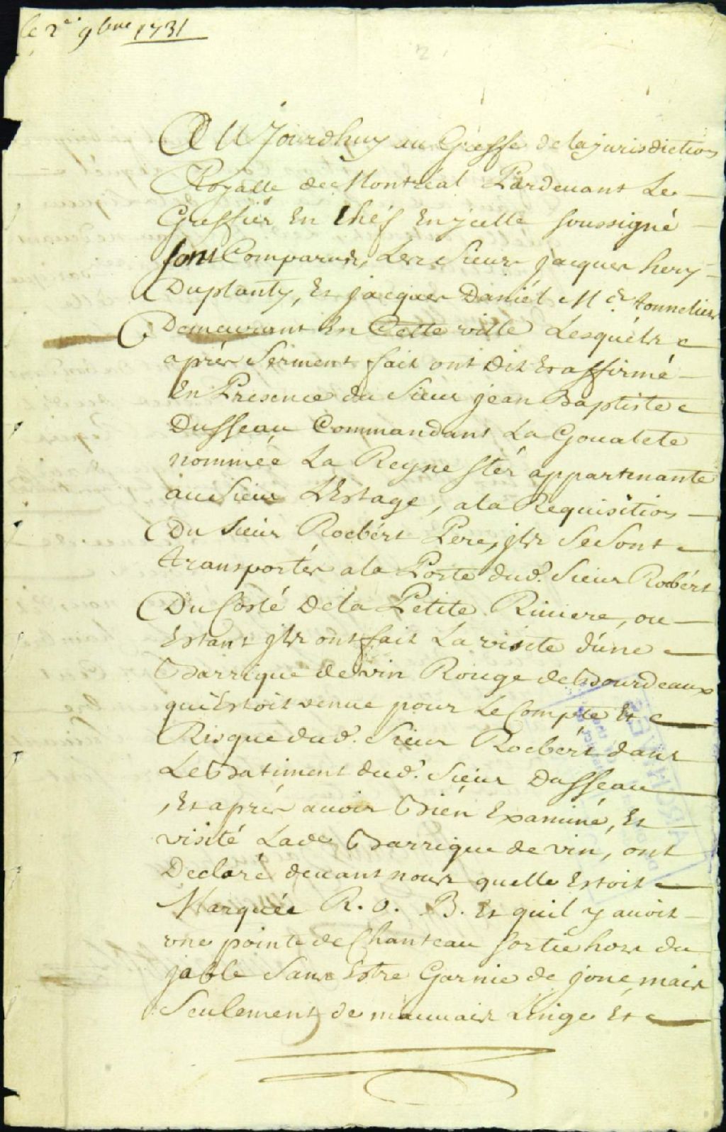 - Procès entre Étienne Rocbert, père, demandeur, et Jean-Baptiste Dussault, capitaine de navire, défendeur, pour le remboursement de liqueur perdue