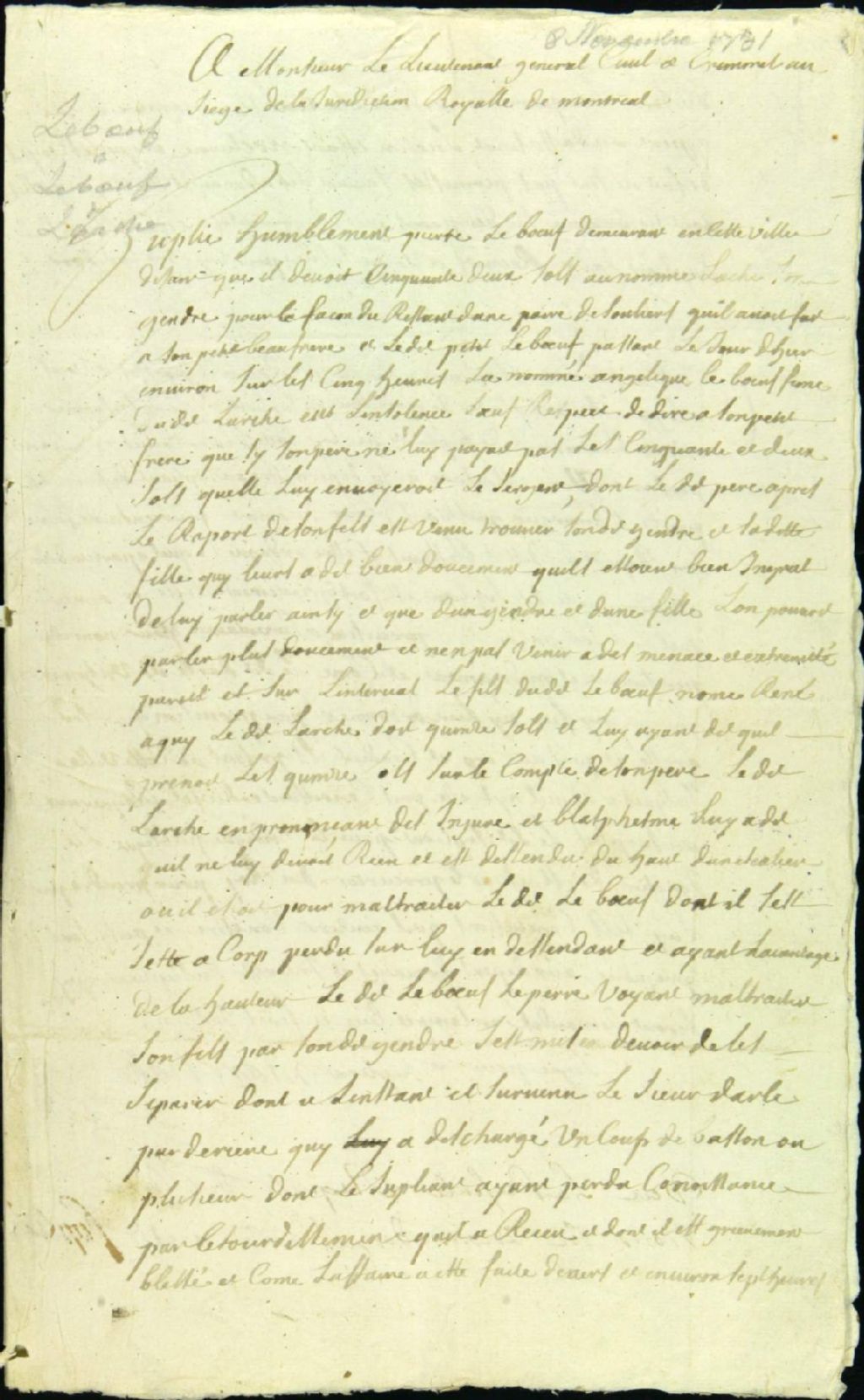 - Ce dossier de matière criminelle est composé des pièces suivantes : la plainte de Pierre Leboeuf disant avoir été frappé à coups de bâton à la tête par François Darle au cours d'une discussion avec sa fille et son gendre Paul-Philippe Larchevêque, époux de Angélique Leboeuf, au sujet d'une dette contractée pour la façon d'une paire de soulier pour son fils. Il demande la tenue d'une information, le versement d'une pension alimentaire et le paiement de médicaments; la permission pour la tenue d'une information judiciaire; l'ordre pour assigner les témoins; le rapport médical par Antoine Forestier; l'information judiciaire; la requête du procureur du roi commis pour " l'adjournement " de François Darle; l'ordonnance pour " l'adjournement " de Darle; la signification et l'assignation à comparaître; la requête du commis procureur du roi pour le récolement des témoignages; l'ordre pour faire assigner les témoins; l'ordre pour le récolement des témoignages et pour le versement d'une somme de 50 livres pour une pension et des médicaments par l'accusé Darle à Leboeuf, en attendant la sentence définitive. Les témoins suivants sont mentionnés dans cette affaire : Étienne Nivard dit Saint-Dizier, 15 ans ; Noël Toupin, 48 ans, voiturier, époux de Françoise Navers ; Marie-Françoise Navers, 38 ans, épouse de Noël Toupin ; Marie Navers, 18 ans, demeurant chez Toupin ; Louis Mercier, 22 ans, serrurier ; Joseph Jetté, 36 ans, tonnelier ; Joseph Lecours, 17 ans et Antoine Giguère, 16 ans