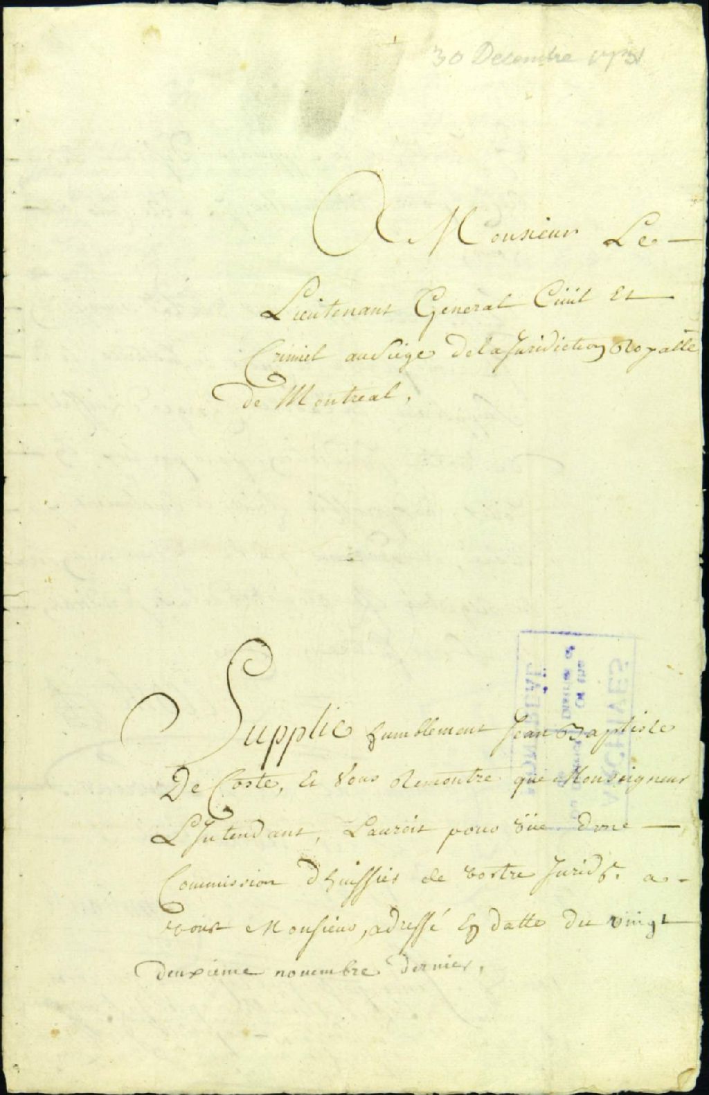 - Ce dossier d'administration civile est composé des pièces suivantes : la requête de Jean-Baptiste Decoste, disant avoir une commission d'huissier de l'intendant, pour être installé comme tel dans la Juridiction royale de Montréal; la communication au procureur du roi lequel requiert information sur la vie et les moeurs de l'intéressé; l'ordonnance pour la tenue d'une information et pour faire assigner les témoins du candidat qui sont les marchands Julien Trottier DesRivières, Pierre Trottier Desaulniers et René de Couagne; le certificat de A. Déat, prêtre faisant les fonctions curiales; et l'information sur la vie et moeurs du candidat