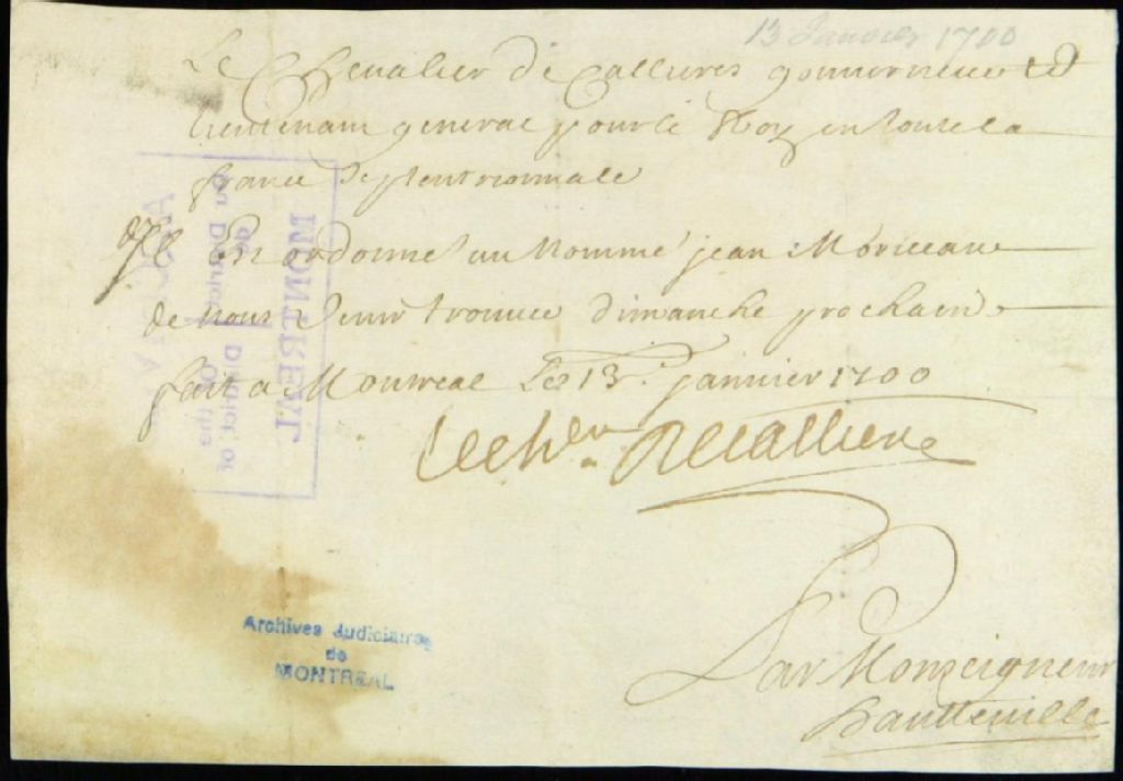 Message de Monsieur Louis-Hector de Callières, gouverneur de la Nouvelle-France, à Jean Morisseau, 13 janvier 1700, Archives nationales à Montréal, Fonds Juridiction royale de Montréal, (06M,TL4,S1,D392).