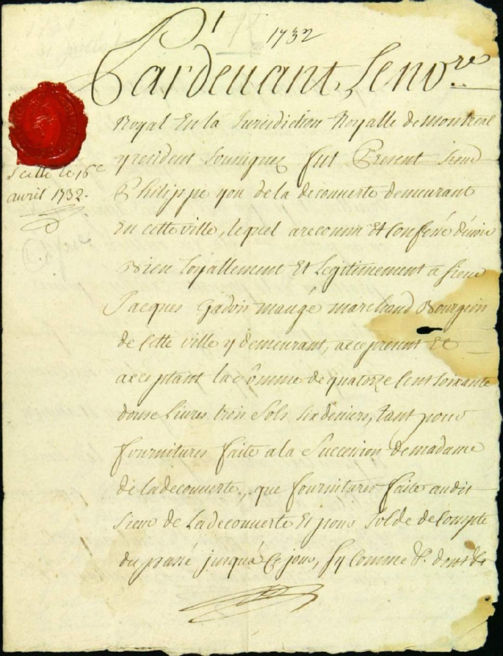 - Ce dossier de matière civile est composé des pièces suivantes : la transcription scellée d'un acte notarié du greffe Adhémar en date du 31 juillet 1731, entre Philippe You de LaDécouverte, lequel s'oblige vis à vis Jacques Gadois dit Mauger pour la somme de 1471 livres, pour solde de fournitures; et le rapport de la signification de l'acte, d'une demande de paiement et d'une assignation à comparaître à l'audience