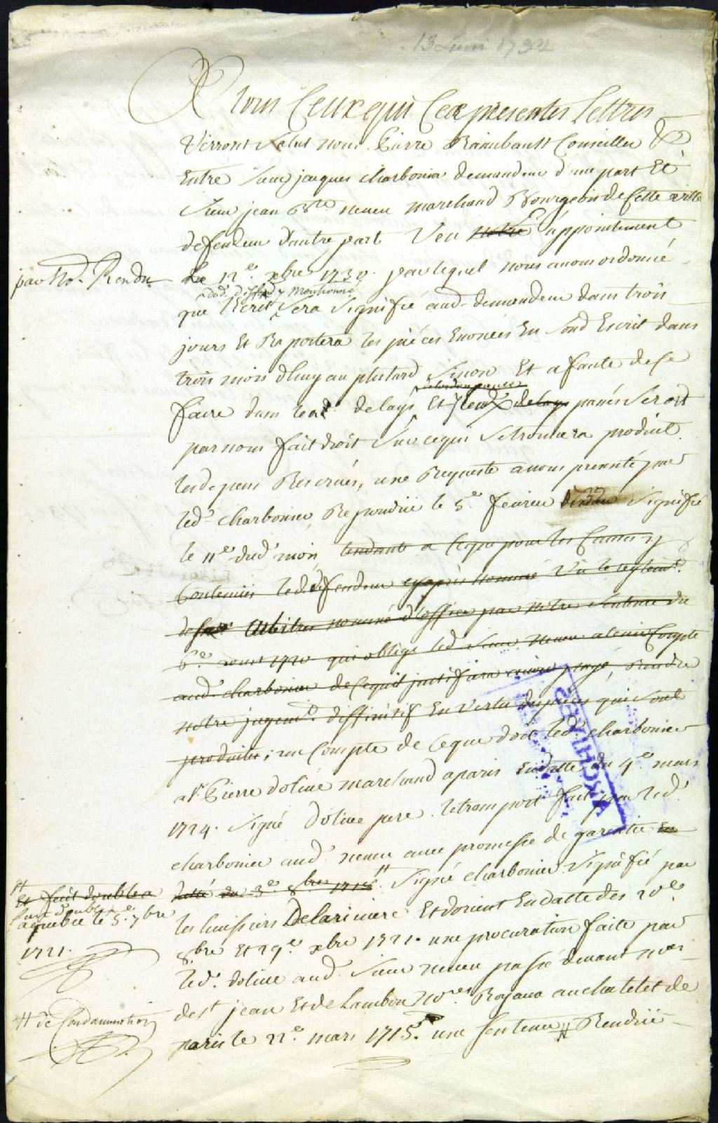 - Procès entre Jacques Charbonnier, demandeur, et Jean-Baptiste Neveu, défendeur, pour transaction