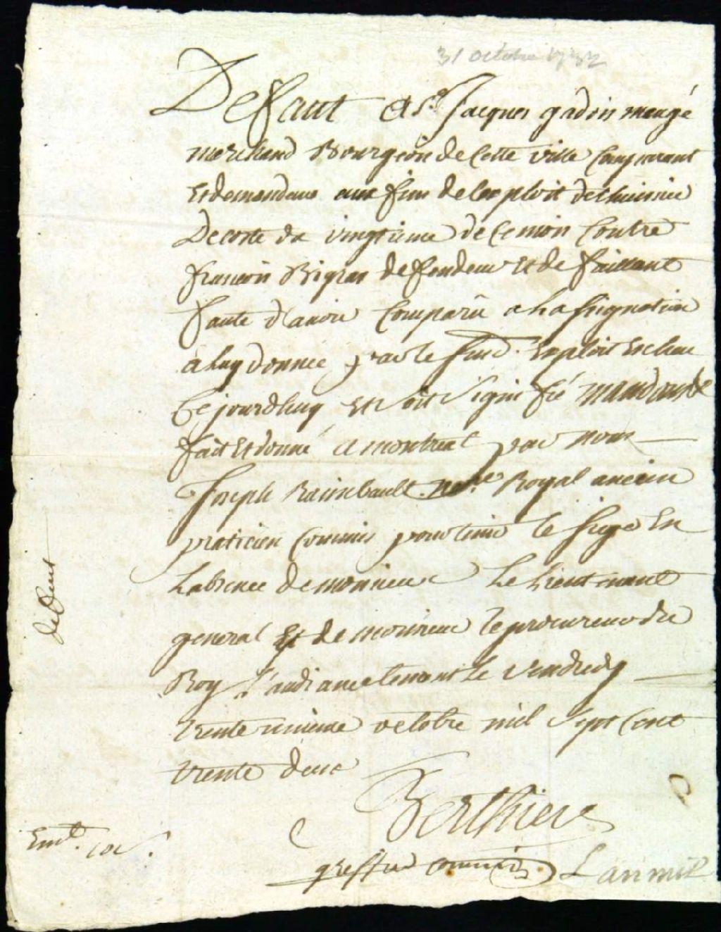- Procès entre Jacques Gadois dit Mauger, marchand, demandeur, et François Bigras, défendeur, pour le paiement d'un billet